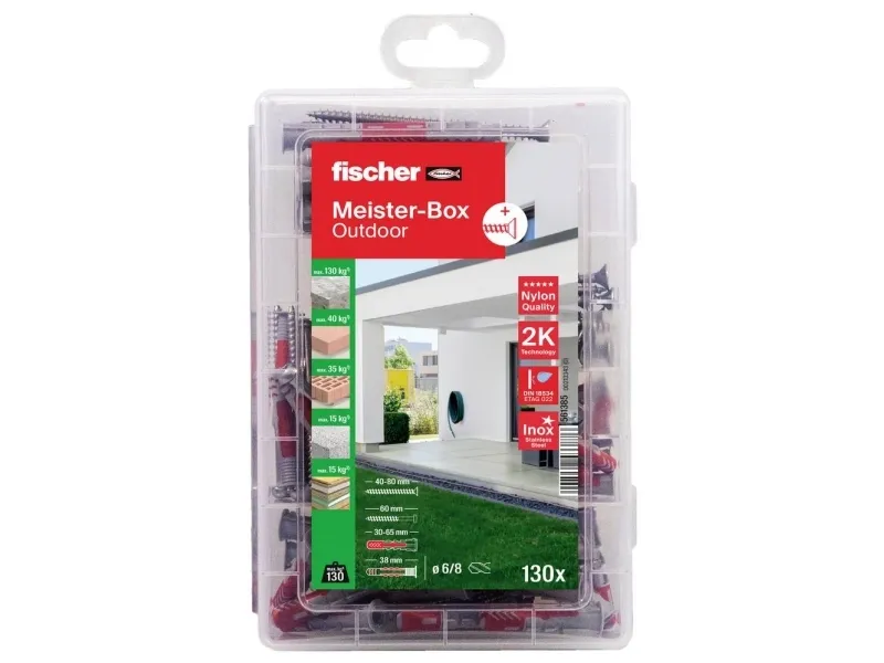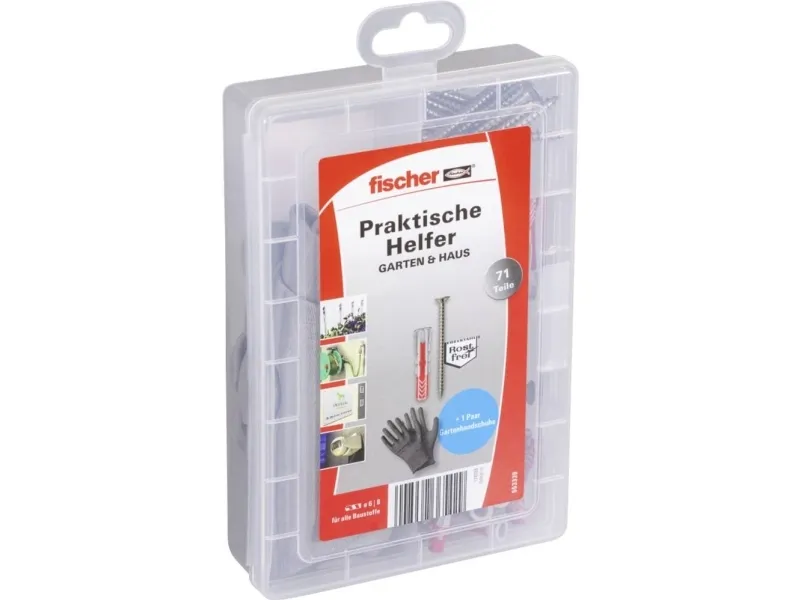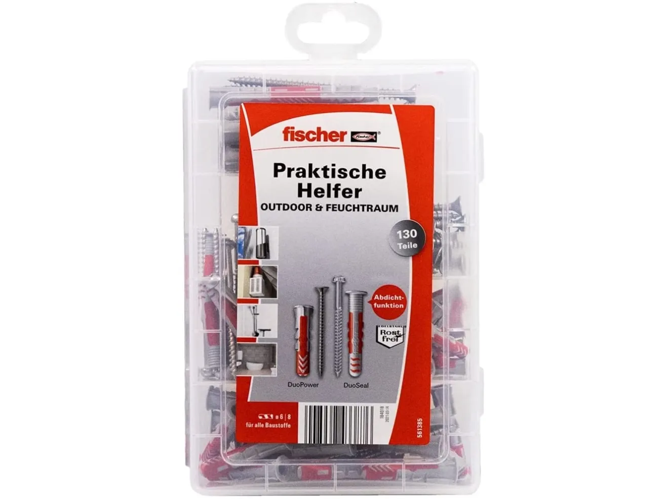 fischer-praktisk hjælper udendørs & vådrum Indholdet sorteret efter til alle anvendelser udendørs og i fugtige rum · inklusive skruer i rustfrit stål · transparent låg: Overblik ved et øjekast · stabil, kan efterfyldes og stables. den praktiske hjælper Box Outdoor & vådrum indeholder sorteret 25 x DuoPower 6 x 30 og 25 x undersænkede skruer 4,5 x 40 i rustfrit stål A2, 15 Duox Power 8 x 40 og 15 x undersænkede skruer 5,0 x 55 i rustfrit stål A2, 10 x DuoPower 8 x 65 og 10 x undersænkede skruer 5,0 x 80 i rustfrit stål A2 samt 15 x DuoSeal 6 x 38 og 15 x panheadskruer 4,5 x 60 i rustfrit stål A2. Boksen fremstillet af slagfast plast i høj kvalitet er ideal for alle fastgørelsesløsninger udendørs og i fugtige rum. Den praktiske hjælpeboks lukker fast og kan fyldes med dyvler. Det transparente låg giver et overblik.
