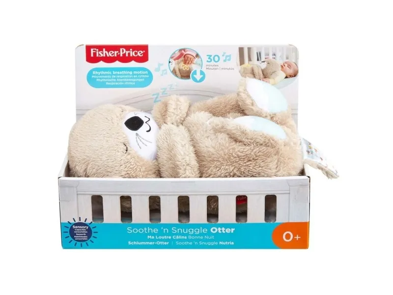Fisher-Price Soothe 'n Snuggle Otter er en unik spilledåse i plysj som trøster babyen nesten slik som du gjør. Den myke magen beveger seg opp og ned i en rytmisk bevegelse som minner om pusting, for å roe babyen på en naturlig måte. I tillegg har den opptil 30 minutter med beroligende musikk, lydeffekter og myke lys. Soothe 'n Snuggle Otter har et søtt ansikt, deilig stoff og en hale i sateng, og denne søte oteren er den perfekte kosevennen til babyen.