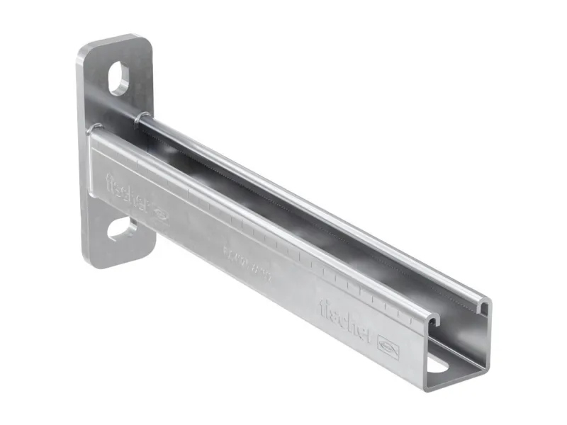 fischer-Udliggerkonsol FCA 41/2,0 - 300 Brandprøvningsrapporten i henhold til MLAR/EN13501 garanterer objektiv testet funktionssikkerhed · det graduerede længesortiment kan dermed tilpasses optimalt til anvendelse · en stabil grundplade på konsollen giver en robust konstruktion, som holder sikkert · de 90° drejede lange huller på bundpladen muliggør en nem justering af konsollen · den udprægede fortanding i skinnen har spændemøtrikken, der sørger for at holde høje tværbelastninger, sikkert greb, for eksempel ved lodret montering fischer-udliggerkonsollen FCA giver mulighed for en hurtig og nem montering af for eksempel rørkanaler langs væggen. Nem montering af konsollen med langhuller i bundpladen, som er drejet 90° til hinanden.