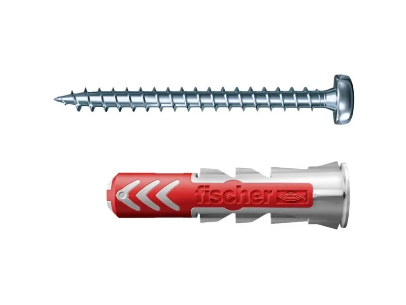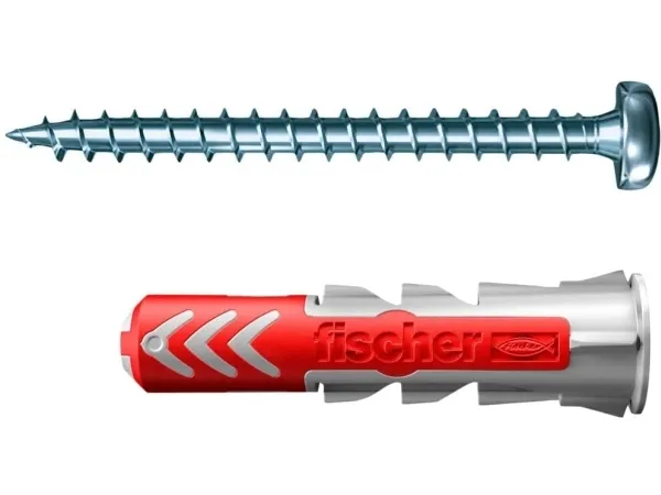 fischer DUOPOWER 6 x 30 pH TX med panhead-skrue fischer DUOPOWER har meget gode holdeværdier med 2 komponenter: Den grå komponent af polyamid i høj kvalitet aktiverer, alt efter byggemateriale, automatisk det optimale funktionsprincip (sprede, klapper, knob) for den bedste pasform. Den røde komponents ekspansionsvinger understøtter sikker spredning og giver ekstra sikkerhed til den grå komponent. Enkel isætning af skruer og rigtigt træk til sidst. Ingen overdrejning af skruen. Kanten, der er formet på dyvelhovedet, forhindrer, at dyvelen glider i borehullet. De medfølgende skruer med linsehoved er optimalt afstemt til fischer ekspansionsrawlpluggen Duopower.