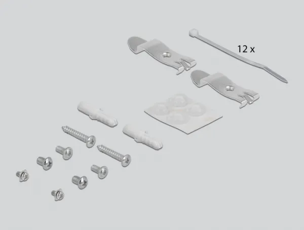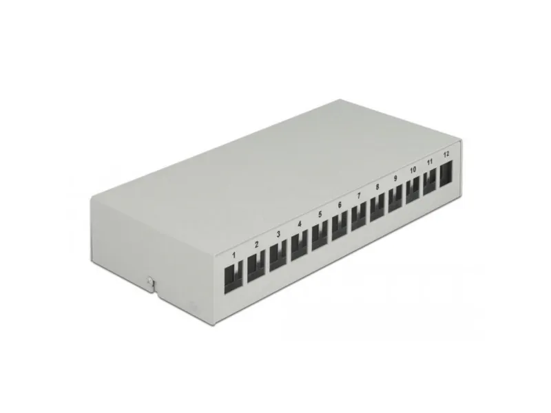This patch panel by Delock can be used as a junction box on the wall or in enclosures. Additionally, clips for DIN rail mounting are included. With its standardized dimensions, it is suitable for easy snap-in mounting of 12 Keystone modules.