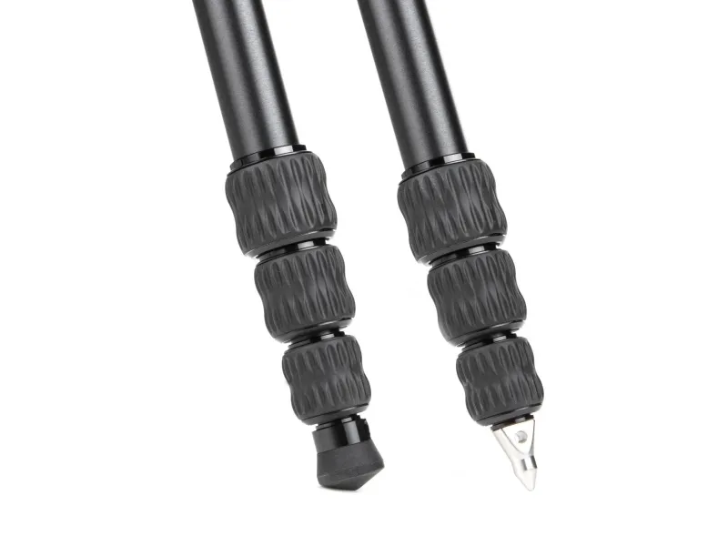 Stability and intuitive operation With its non-slip rubber feet and the included metal spikes, the tripod stands securely on any surface. For more stability, the load hook on the center column can be loaded with e.g. a backpack. The 4 leg sections can be loosened and locked again in no time via the turn locks (ring locks). Thanks to the soft foam rubber handles, you always have a secure grip on your tripod. In winter, they also serve as protection against the cold.