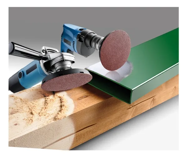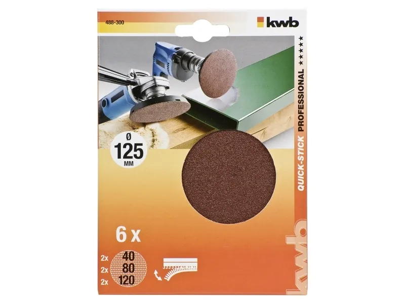 Sanding discs, Ø 125 mm, for wood and metal, aluminium oxide coated, resin bonded, strong backing material, with hook-and-loop fabric backing, for use with random orbit sanders, for sanding metal and wood, paint, varnish, filler, stone and plastics.