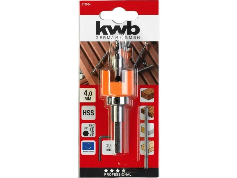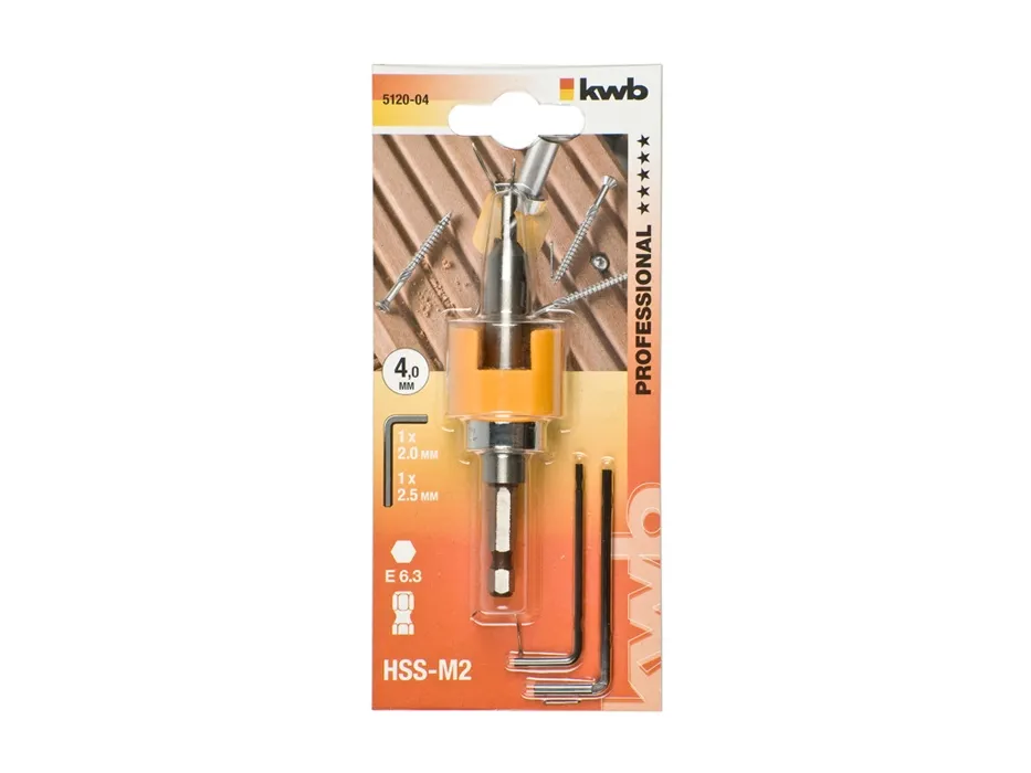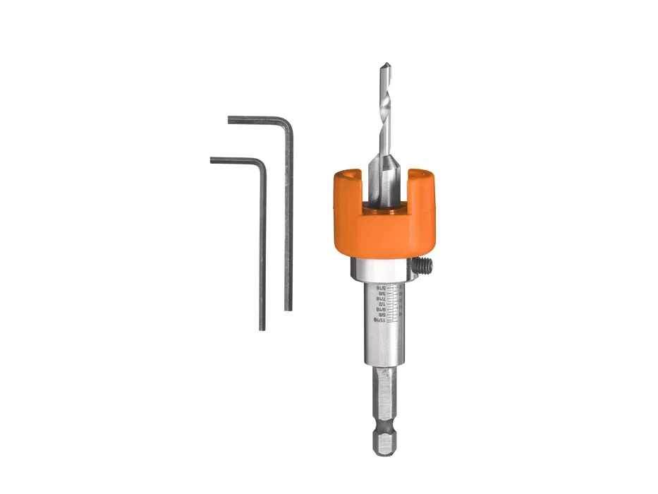 Hardwood drill bit, HSS-M2, with adjustable counterbore and countersink, ball-bearing counterbore stops rotating when it grounds, preventing marking of the wood, 1/4" hexagon shank to ISO 1173, E 6.3, for Bangkirai, hardwood, softwood, ideal for pre-drilling of hardwoods when working on decking or garden furniture, with perfect bore and countersink depth on every fixing.