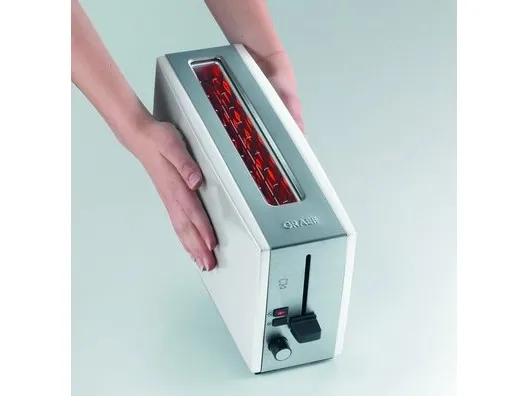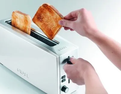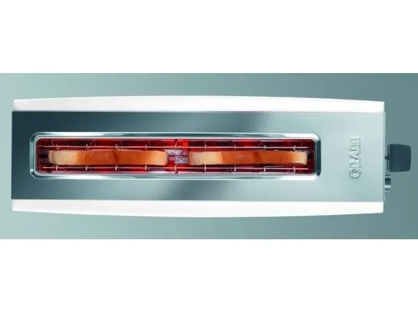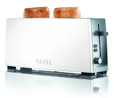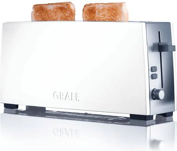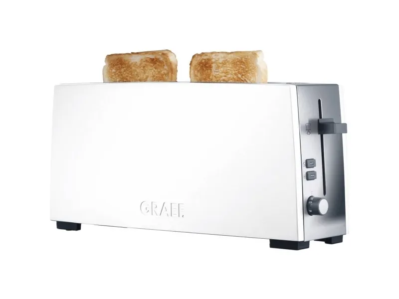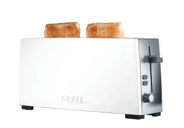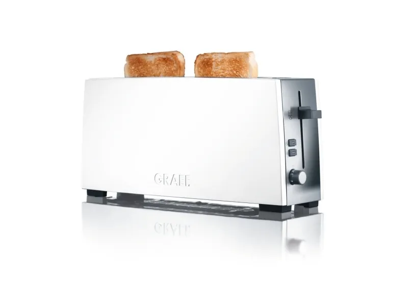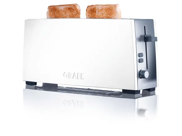 Breakfast delight\n\nWelcome the day with the aroma of toast. \n\nPrecise sensor technology and a high quality finish leads to a pleasureable breakfast. \n\nA nice day with GRAEF!\n\n- Long slot toaster for 2 toasts.\n- Stop button / Defrost button.\n- Extra-lift.\n- Control knob with click click function in 6 steps.\n- Stainless steel crumb tray.\n- Bread slice centring.\n- Cable rewind with extra long supply cord.\n- Heat insulated housing compliant with the new thermal insulation act.\n- Aluminium high polished white laquered/Stainless steel high polished.\n- Separate attachment for buns.