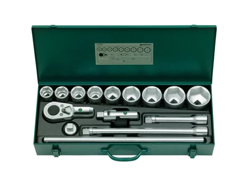 OBS! Denne produktbeskrivelse er endnu ikke blevet oversat til dansk af vores oversættere. Derfor er teksten maskineoversat fra den tyske originaltekst. I stabil stålpladekasse Indhold 15 dele: 9 toppe med sekskant nr. 55: 32 - 34 - 36 - 38 - 41 - 46 - 50 - 55 - 60 mm 1 skralde nr. 552 2 forlængerstykker nr. 559/8 (200 mm), nr. 559/16 (400 mm) 1 vinkelled nr. 554 1 hoved til tværgreb nr. 556 1 håndtag nr. 558