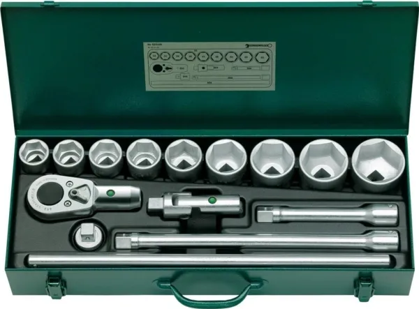 · i stabil stålpladekasse · indhold 15-dele: · 9 topnøgleindsatser med sekskant nr. 55: 32 - 34 - 36 - 38 - 41 - 46 - 50 - 55 - 60 mm · 1 skraldenøgle nr. 552 · 2 forlængerstykker nr. 559/8 (200 mm), nr. 559/16 (400 mm) · 1 Vinkelled nr. 554 · 1 hoved til tværgreb nr. 556 · 1 håndtag nr. 558