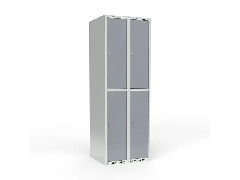 Skoleskab, helsvejst 2x400 med skråt tag. 2 rum i højden. Lys grå kabinet (RAL 7035) med pulverlakeret ståldør lys blå (RAL 5012). Leveres med færdigmonteret greb for hængelås ASSA 3906. Totalmål (b x d x h) 800 x 550 x 1900 mm.