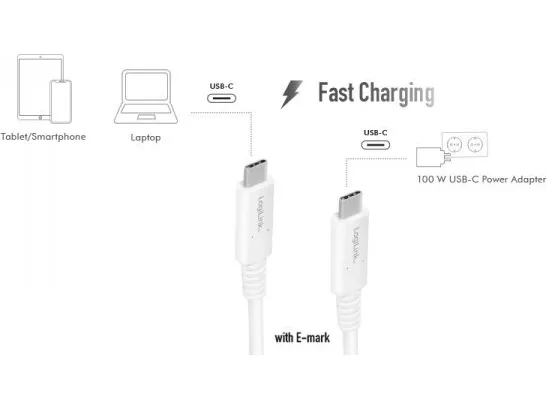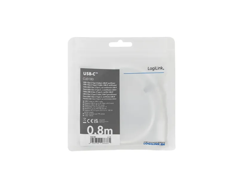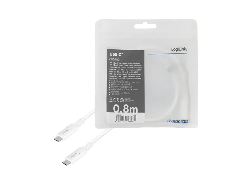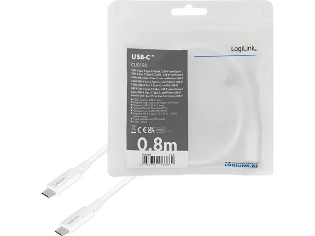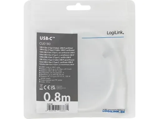LogiLink CU0180. Cable length: 0.8 m. Connector 1: USB C, Connector 2: USB C, Maximum data transfer rate: 40 Gbit/s, Connector contacts plating: Nickel, Product colour: White, Magnetically shielded