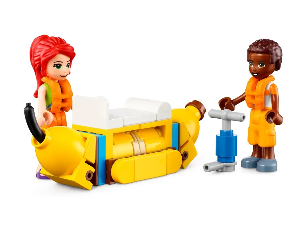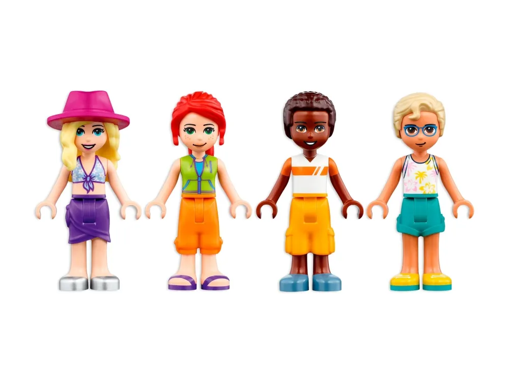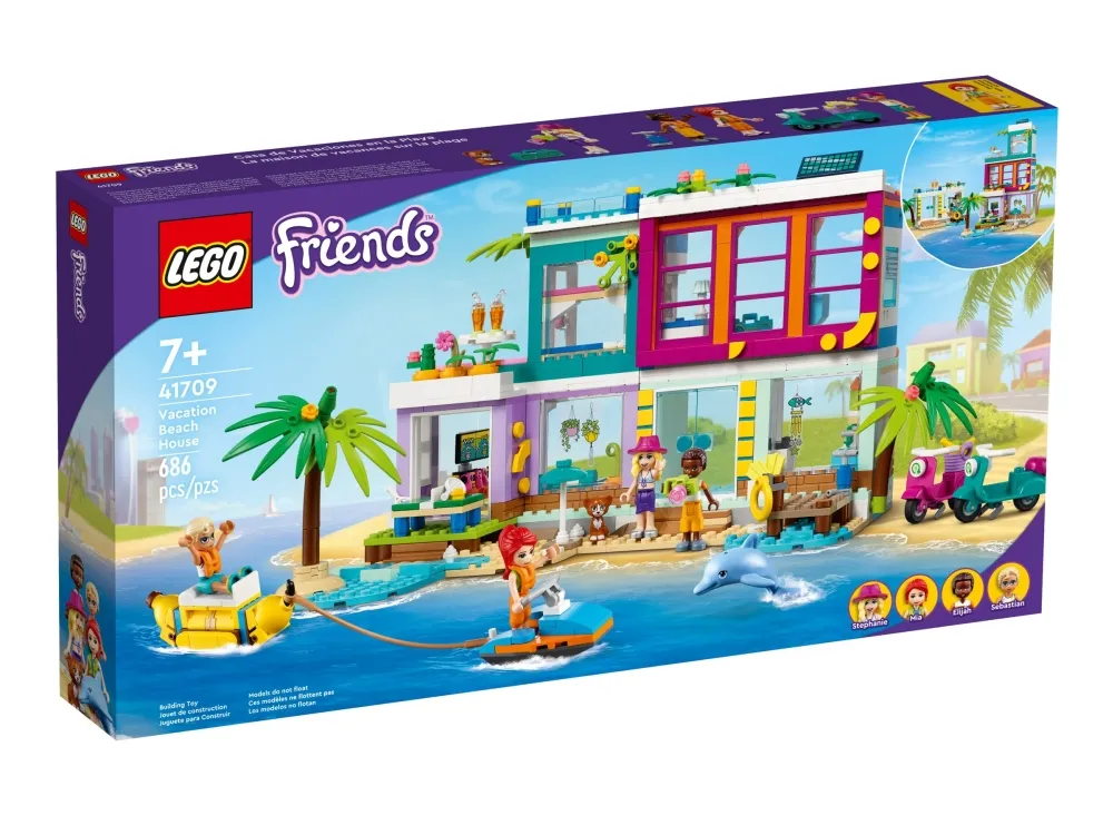LEGO® Friends gave med seks karakterer – settet Feriehus på stranden (41709) inneholder fire minidukker, inkludert LEGO Friends Mia, og figurer av en delfin og en katt