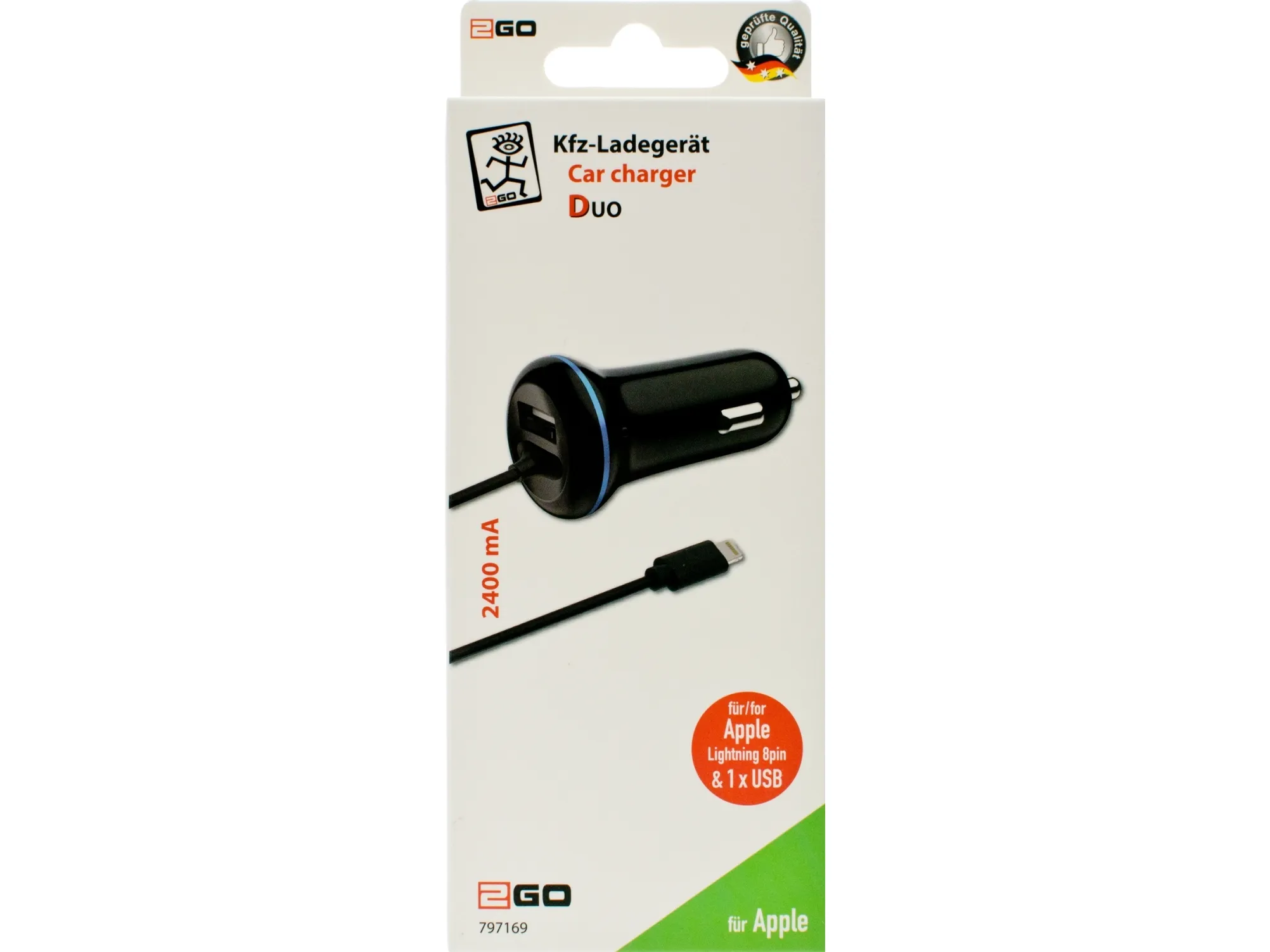 2GO 797169. Charger type: Auto, Power source type: Cigar lighter, Charger compatibility: Universal. Input voltage: 12/24 V, Maximum output voltage: 5 V. USB 2.0 ports quantity: 1. Cable length: 1.4 m, Product colour: Black