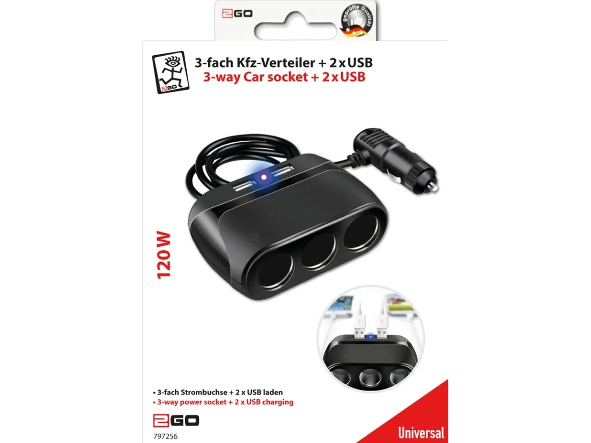 2GO 797256. Charger type: Auto, Power source type: Lightning, Charger compatibility: Universal. Input voltage: 12/24 V, Maximum output voltage: 12 V. USB 2.0 ports quantity: 2. Cable length: 0.45 m, Product colour: Black