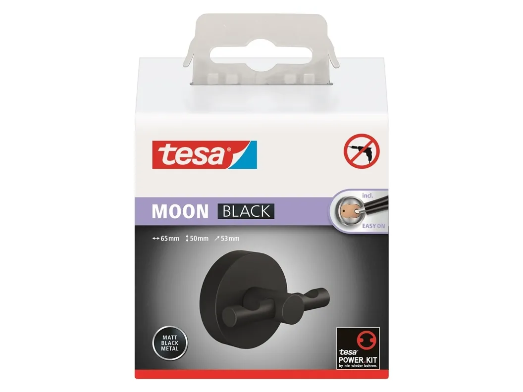 tesa® MOON BLACK badekløbekroge, mat sort - borefri, inkl. limløsning - 50 mm x 65 mm x 53 mm