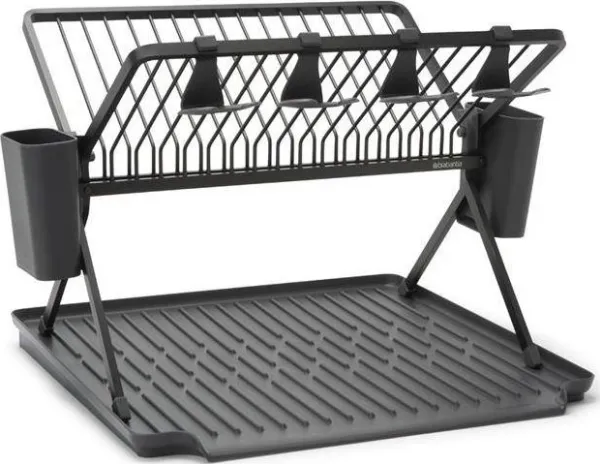 The dishes don’t wash themselves – but they do dry naturally! Just leave them on this large Brabantia SinkSide Foldable Dish Drying Rack with drip-tray. It happily holds up to 17 plates and has a hanging space for 4 wineglasses. The two baskets for drying cutlery are removable, making it easy to collapse the rack and tidy it away. The loose drip-tray prevents your countertop from getting wet and drains directly into the sink - a rocking rack.Brabantia 139482. Product colour: Black. Country of origin: China. Width: 510 mm, Depth: 420 mm, Height: 330 mm
