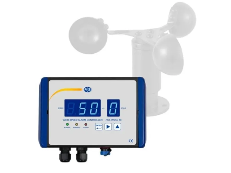 Anemometer / vindadvarselsenhed PCE-WSAC 50-220 anemometer med foralarm / visning af vindhastighed / enkel betjening / visning af gennemsnitshastigheden for de sidste 2 og 5 minutter, vindadvarselsenheden kan anvendes i forskellige anvendelsesfelter. I anvendelse gennemfører vindmåleren allerede målinger ved de mindste vindbevægelser. Vindadvarselsapparatet kan på den ene side anvendes til overvågning af den aktuelle vindhastighed. På den anden side er der også mulighed for at benytte vindmåleren til måling af gennemsnitsværdi af de sidste to eller fem minutter. Hvis vindhastigheden er højere end de forudindstillede værdier, skal der først aktiveres en foralarm, inden alarmen vises. Begge alarmer afgives visuelt og akustisk på vindadvarselsapparatet. Hvis foralarmen skulle gribe ind, blinker en gul LED på forsiden af apparatet, og et bipper afgiver en periodisk advarselstone. Hvis den normale alarm skal aktiveres, blinker den røde LED og bipton afspilles kontinuerligt fra apparatet. Generelt anvendes vindadvarselsapparatet overalt, hvor der skal udføres vindovervågning. Dette er ofte tilfældet i fabrikker, miner, vindmøller og lignende. Ved behov kan der også tilsluttes et relæ til vindmåleren. Ud over de lave vindhastigheder udmærker vindmåleren sig ved sin høje pålidelighed og høje nøjagtighed.