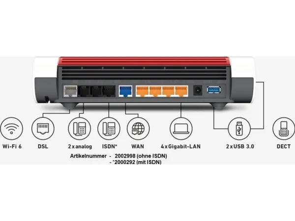 High-speed downloads and streaming fun – with the FRITZ!Box 7590 AX, your home network is ready for anything. Wi-Fi 6 ensures top Wi-Fi speeds. Supervectoring for DSL up to 300 Mbit/s leaves nothing to be desired. A wide range of features for your home network and a complete telephone system with a DECT base station round out the highlights.