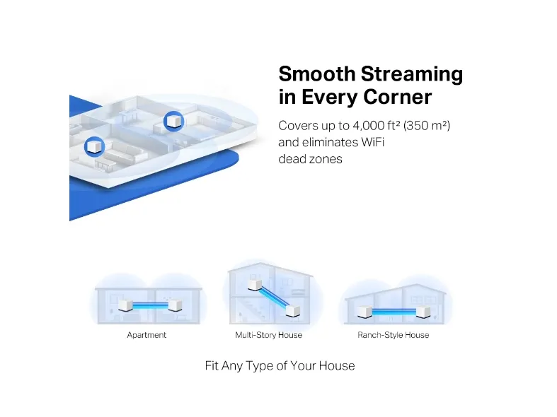 Smooth Streaming in Every Corner Compared with a regular single router which has limited range for remote corners of the home, Halo H50G works as a unified system to guarantee a fast and stable WiFi signal throughout your home, covering up to 6000 ft² (550 m²) and eliminating WiFi dead zones. Enjoy smooth mesh WiFi from the front door to the backyard.