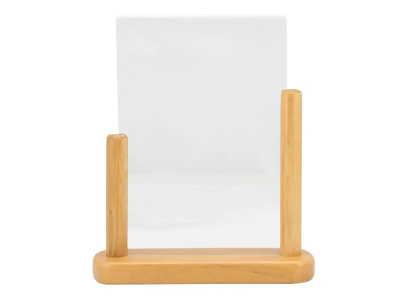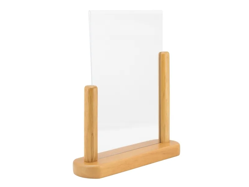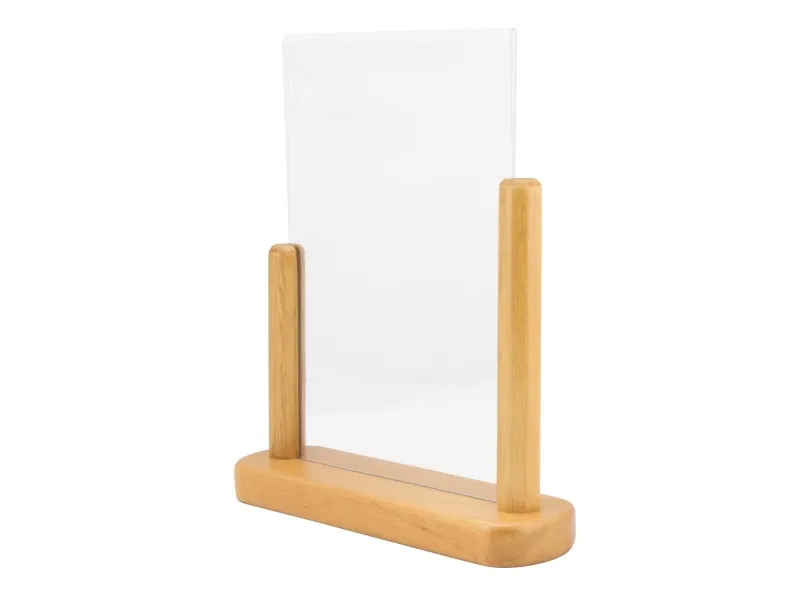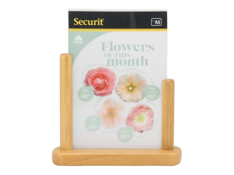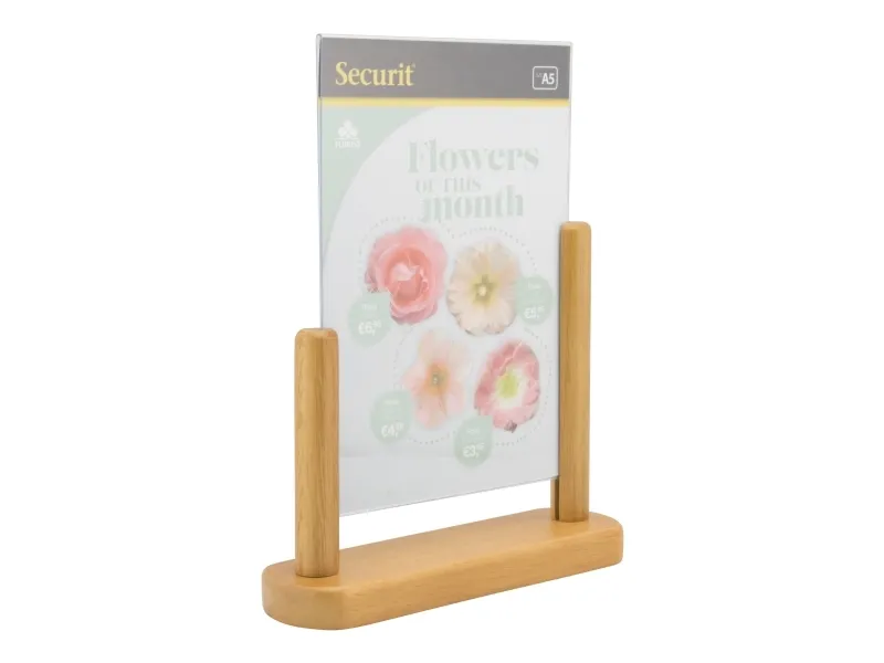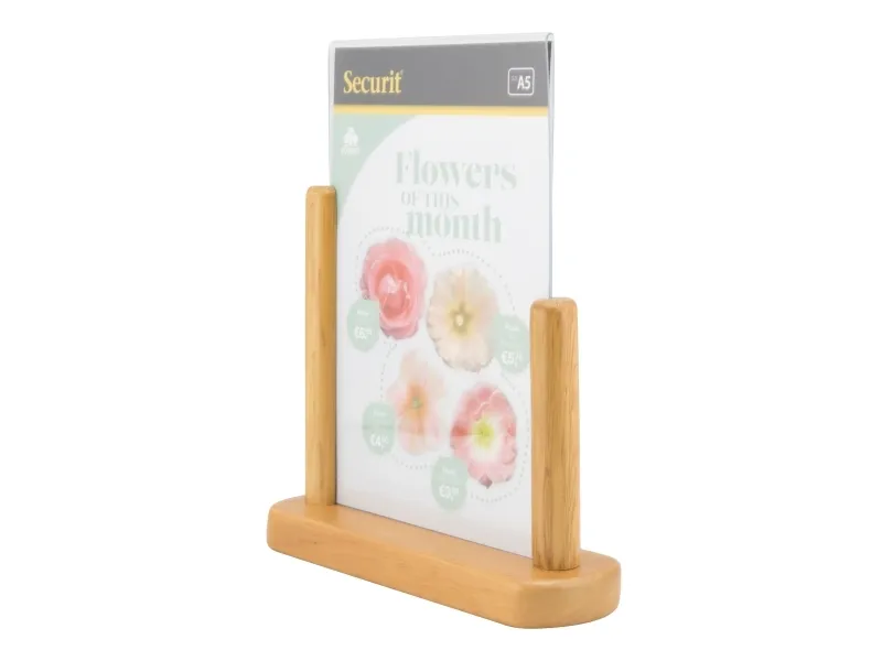 Securit® A5 plakatramme i akryl med en solid træbase er den perfekte måde at promovere en menu, et særtilbud eller en begivenhed på. Har et simpelt, men stilfuldt design, der passer ind i de fleste interiører. Denne dobbeltsidede akrylramme leveres med en hårdt lakeret, vejrbestandig bund i bøgetræ. Sæt din plakat i ved blot at fjerne bunden fra rammen. Fås i forskellige størrelser og farver.