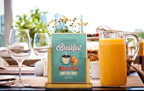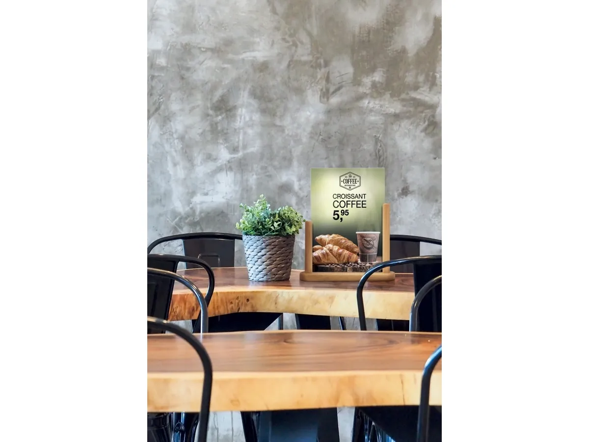 En perfekt måde at promovere en menu, et særtilbud eller en begivenhed på Akryl plakatramme A5 med massiv træbund Hårdtlakeret, vejrbestandig bund af bøgetræ Dobbeltsidet Fås i forskellige størrelser og farver