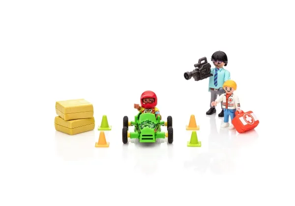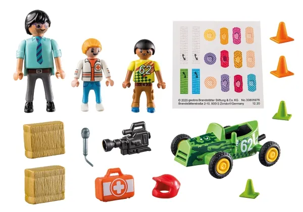 Contents/Equipment: 1 Mikey Medic, 1 reporter, 1 racing driver's child, 1 soap box, 2 straw bales, 1 camera, 1 microphone, 1 first aid kit, 4 cones, 1 plaster sheet