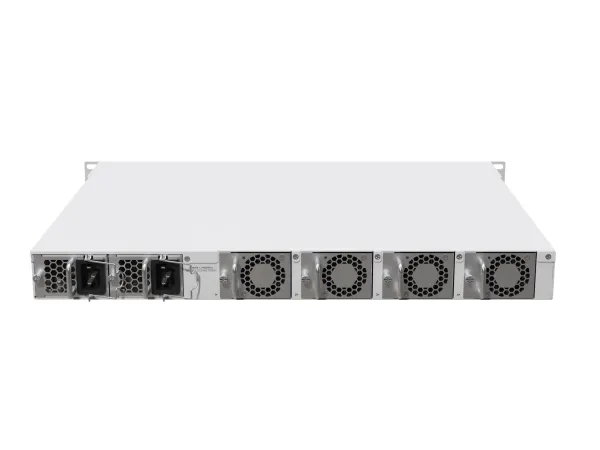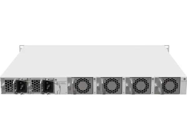 There are 2x QSFP28 cages for blazing-fast 100 Gigabit connectivity, 12x SFP28 cages for 25 Gigabit networking, and a Gigabit Ethernet port. The device comes with 16 GB of RAM, decent NAND storage, and two M.2 SATA slots for additional storage. There are four hot-swappable fans, as well as dual-redundant hot-swap power supplies. And these PSUs might look familiar if you have used our CCR1072 before: you can keep using your previous hot-swap power supplies and SFP modules.