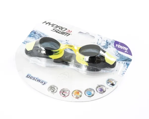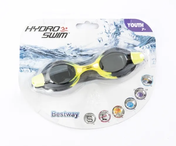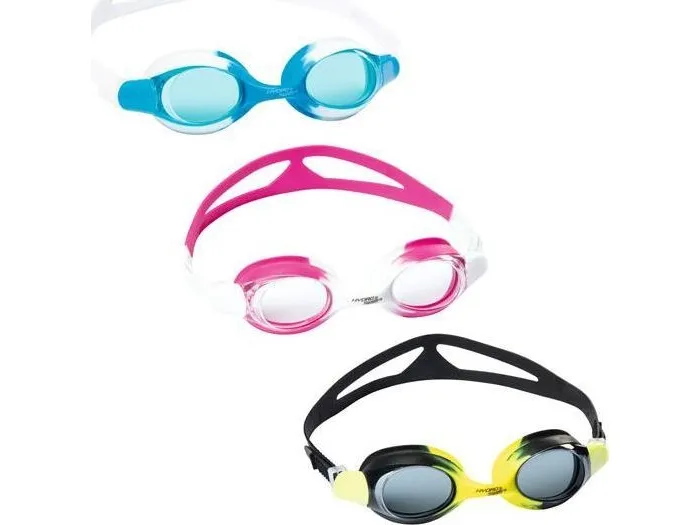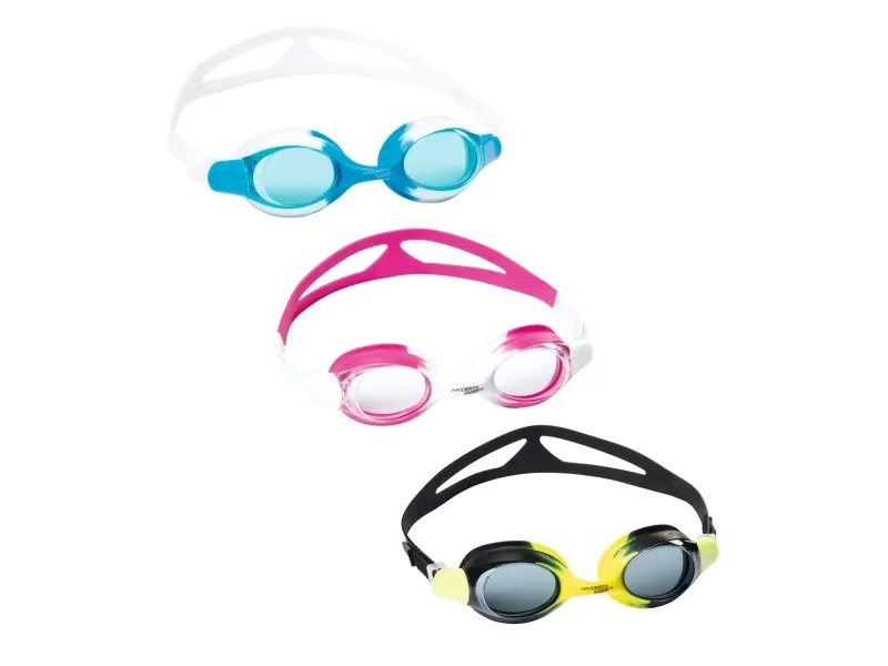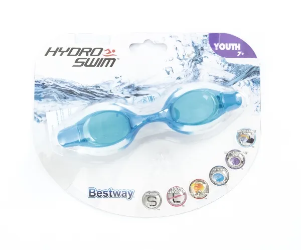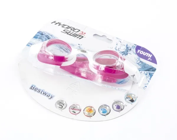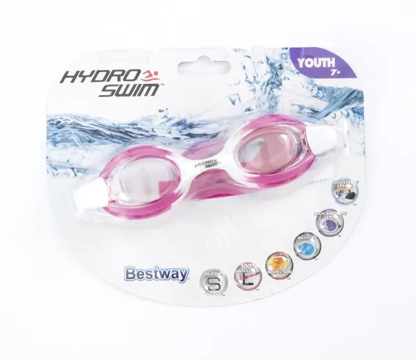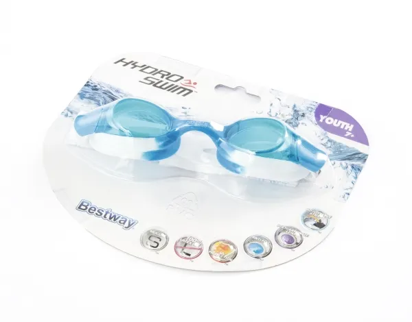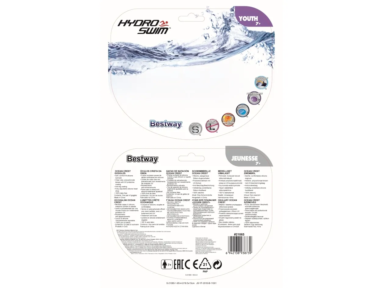 Lysreflekterende linser i polykarbonat og UV-beskyttelsesbelægning Antidugbelægning Fuldt justerbar hovedrem i silikone Indhold: 1 par briller The Hydro-Swim? Ocean Crest Goggles by Bestway® are the perfect accessory for your kid?s fun underwater experience in the pool or the ocean. Geared for ages 7 and up, the Ocean Crest Goggles feature soft, comfort-fit silicone eyecups. The polycarbonate, clear-view lenses come with UV protective coating and have an anti-fog coating for crystal clear underwater views. Available in 3 colors, the 100% latex free goggles have a fully adjustable silicone head strap so they stay in place on your child?s next underwater adventure. When it's time to go swimming, be sure your little one has the Hydro-Swim Ocean Crest Goggles!