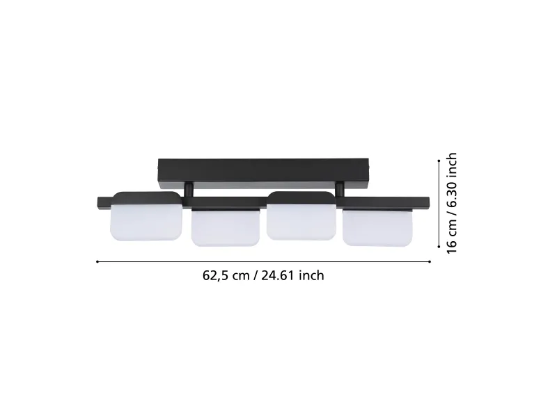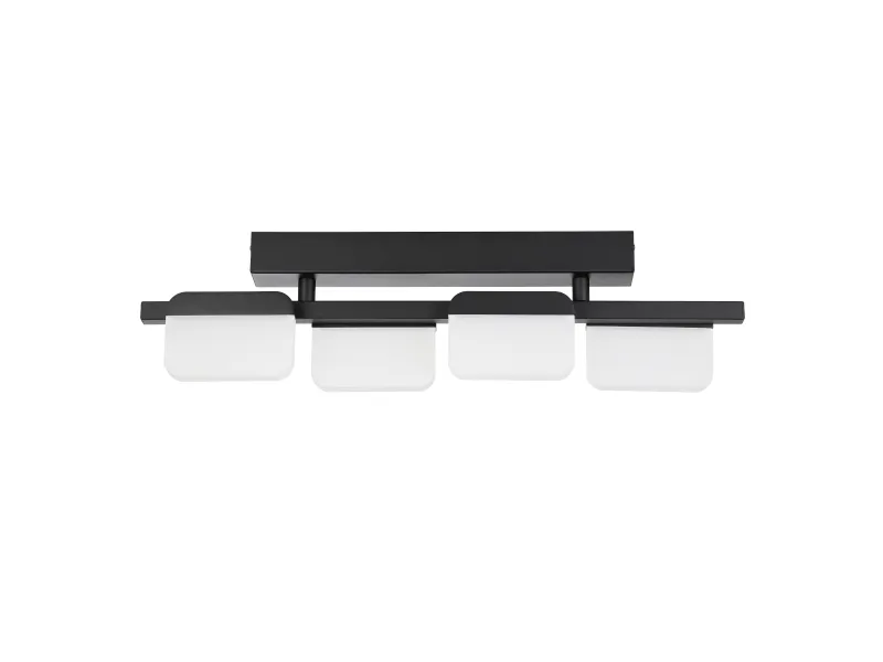 LED-loftlampen ERVIDEL er fremstillet med en sort metalbase, hvortil der er fastgjort en langstrakt metalbeslag i samme farve. På denne sidder fire satinmatte akryl-lyskilder, som er placeret skiftevis. De integrerede LED'er afgiver behageligt varmt hvidt lys og kan dæmpes via en passende drejedæmper på væggen. Den minimalistiske loftlampe passer fremragende ind i moderne indretninger og er en særlig belysning i køkkenet, stuen, soveværelset, spisestuen eller gangen.
