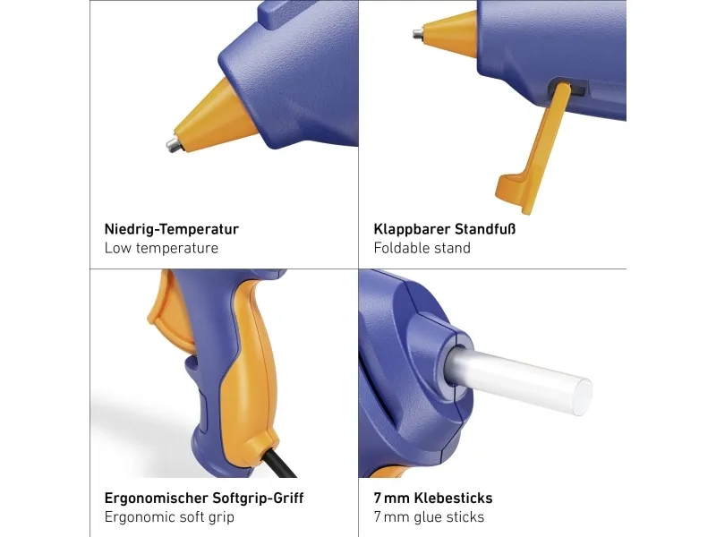 OBS! Denne produktbeskrivelse er endnu ikke blevet oversat til dansk af vores oversættere. Derfor er teksten maskineoversat fra den tyske originaltekst. Sikrere gør-det-selv og klæber ved lavere temperaturSmeltetemperatur 85°, opvarmningstid ca. 8 min.Ergonomisk konstruktion og fremragende haptik med 2-komponenthusInkl. 6 x 7 mm Cristal limpinde 85°C.