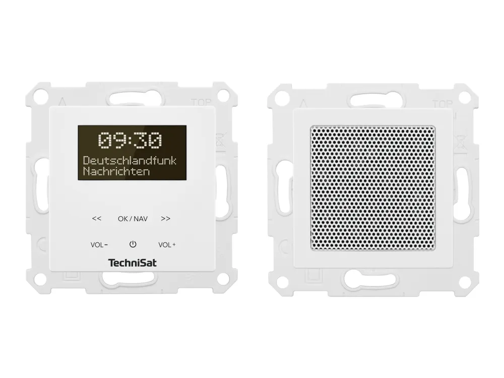 The TechniSat DigitRadio UP 55 is a compact, flush-mounted radio for flexible installation, for instance in a double flush-mounted socket. The device consists of two inserts: a flush-mounted radio with OLED display and touch operating panel, and a flush-mounted speaker. Both inserts measure 55 x 55 mm and can thus be combined with virtually all commercially-available mounting frames produced by renowned switch program manufacturers. If desired, you can connect a second speaker to the radio section. The radio receives broadcasts via DAB+ and FM, and music streaming via Bluetooth, producing excellent sound quality from the speaker. Ideal for playlists and playing music via your smartphone. Featuring DAB+ and FM station memories, each with capacity for 20 stations. The time display with alarm function and sleep timer also makes the DigitRadio UP 55 an attractive proposition as a space-saving radio alarm. This unit is intended for flush-mounting only. Connection to the mains power may only be performed by certified electricians.