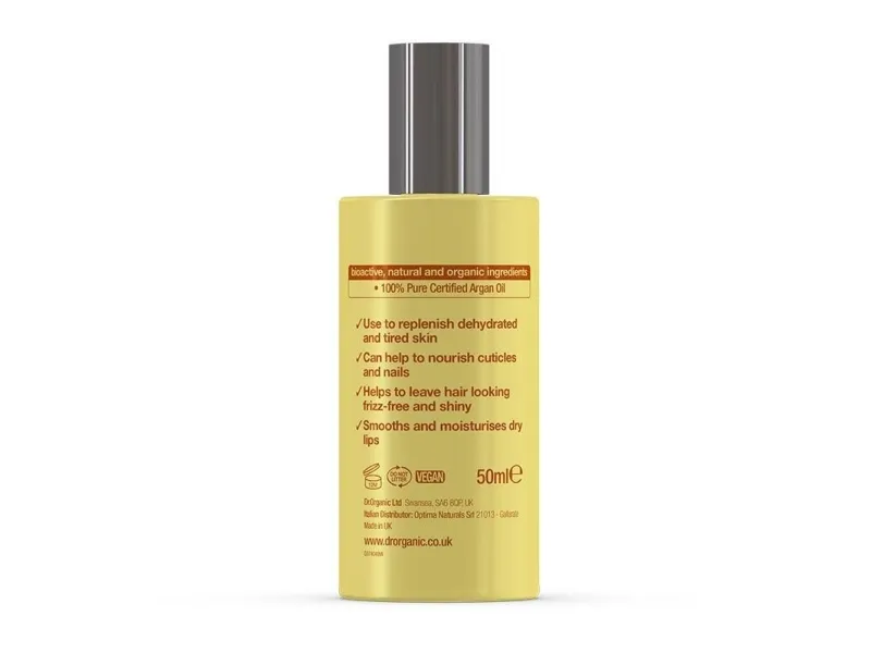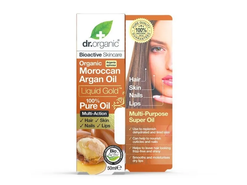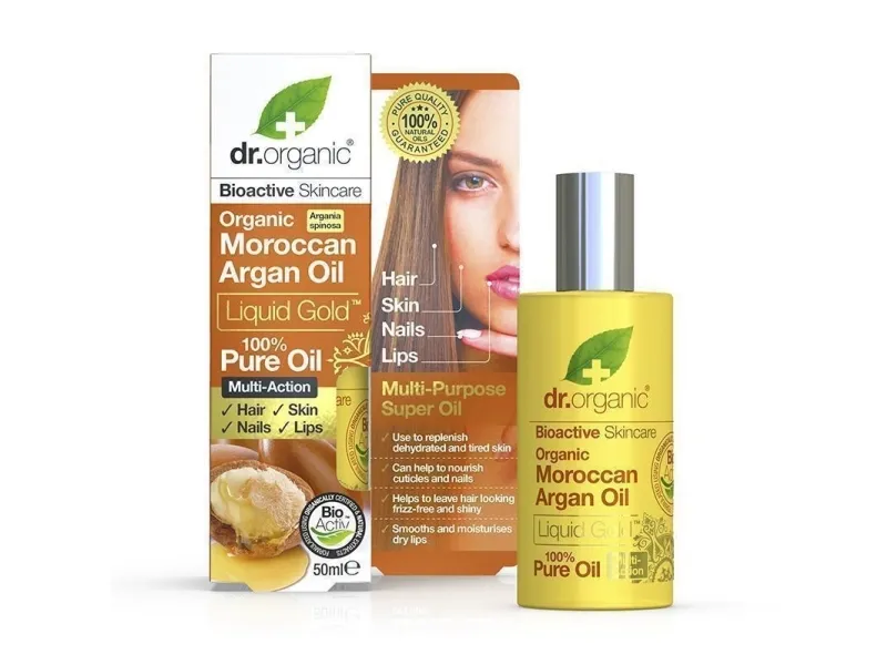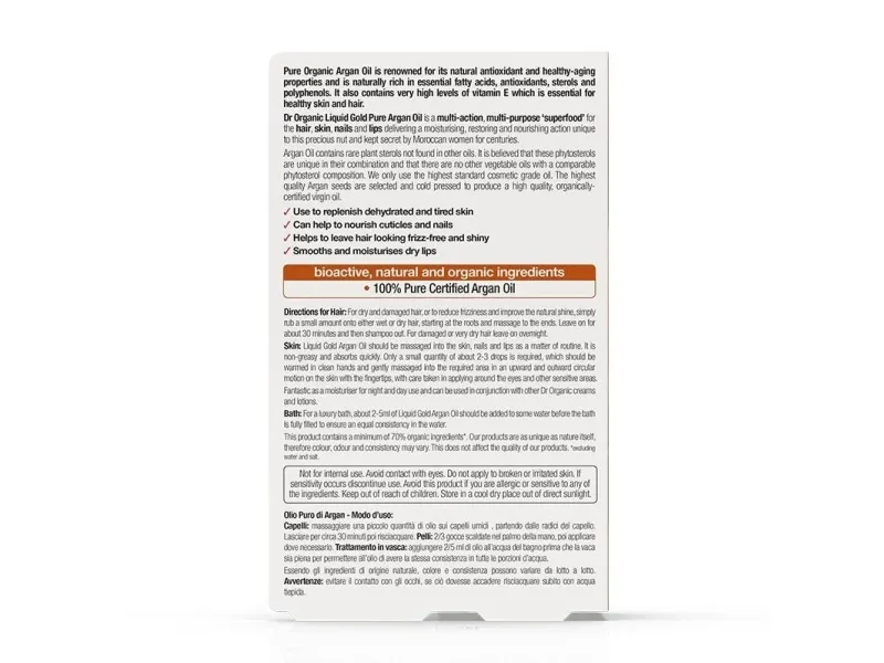 Pure Organic Argan Oil is renowned for its natural antioxidant and healthy-ageing properties and is naturally rich in essential fatty acids, antioxidants, sterols and polyphenols. It also contains very high levels of vitamin E which is essential for healthy skin and hair. Dr Organic Liquid Gold Pure Argan Oil is a multi-action, multi-purpose ‘superfood’ for the hair, skin, nails and lips delivering a moisturising, restoring and nourishing action unique to this precious nut and kept secret by Moroccan women for centuries.