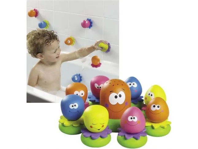 Wonderful, colourful, floating bath island toy, featuring mummy octopus that acts as a pouring cup and her 8 little babies that can stick to the sides of the bath or tiles. Each baby is a water squirter and features a different number that corresponds to a number on the base for number matching fun.