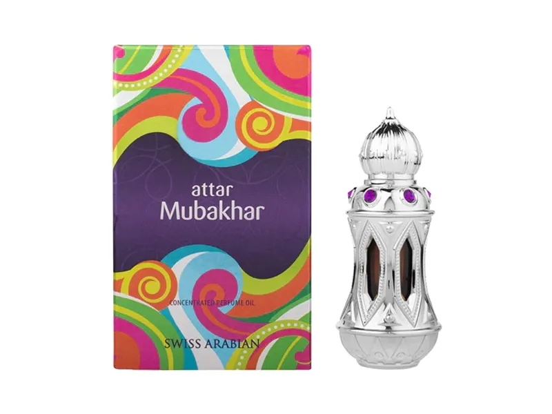 Swiss Arabian Attar Mubakhar is a unisex fragrance that blends citrus floral resinous and woody accords Its top notes pair bergamot and mandarin orange for sweet juicy and lightly spicy opening The heart brings together several classic ingredients intoxicating rose