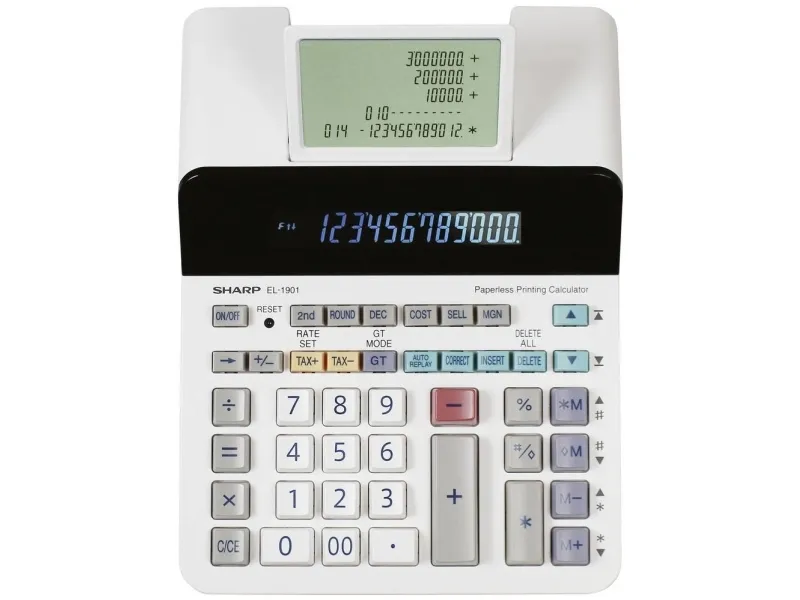 Powerful model that offers a unique combination of the functionality of both printing and desktop calculators. The combination of a 12-digit display and a 5-line LCD allows you to detach from traditional paper and with up to 300 steps Check & Correct function, you’re able to both see and edit your calculations. Thanks to the absence of a printing mechanism, this calculator is also completely silent and ecological. Other features include Cost/Sell/Margin, +TAX/-TAX, rounding up and down, decimal settings, Grand Total, double zero and 4 key memory. Power only by the supplied adapter.Sharp EL-1901. Form factor: Desktop, Type: Display. Digits: 12 digits, Display number of lines: 5 lines, Display tilting. Tax calculation. Power source: AC/Battery. Product colour: White