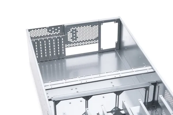 The mainboard is mounted at the usual place at the back of the case. There are also two mounting areas for ATX power supplies. There are also two openings for bulkhead fittings. These can be used to connect the ServerRack water cooling to an external radiator or chiller.
