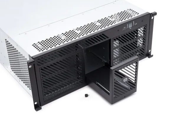 If you want to use the Alphacool ES 4U 19" ServerRack as file server or backup server, you can of course do the same. Six 5 ¼" drive bays are available in the front for this purpose. Of course, any hot-swap cages for 4U server racks can also be installed and used here.