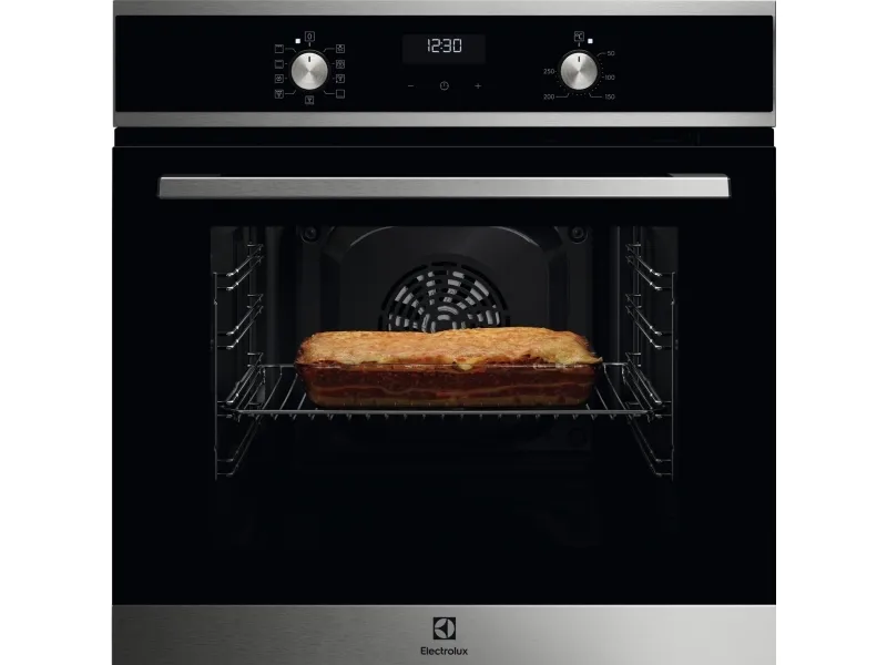 Electrolux EOF5H40BX. Oven size: Medium, Oven type: Electric, Total oven(s) interior capacity: 65 L. Appliance placement: Built-in, Product colour: Black, Control type: Rotary. Clock type: Electronic, Timer type: Digital. Energy consumption (conventional): 0.89 kWh, Energy consumption (forced convection): 0.78 kWh, Energy efficiency scale: A+++ to D. Lamps quantity: 1 lamp(s)