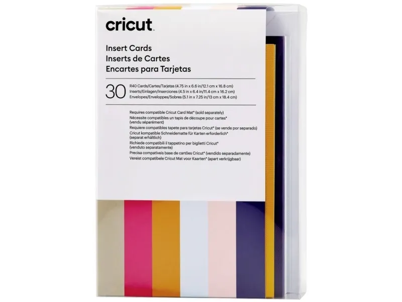Quick, personalized greeting cards with big impact are at your fingertips with Cricut Insert Cards. Cut intricate and meaningful words and images into the face of the card to let the beautiful insert color show through. The ingenious glue-free design allows for two-tone, depth-filled cards without mess or hassle. This sampler includes cards in a trio of colors, complimentary inserts, and white envelopes - an exciting assortment to please every card recipient on your list!