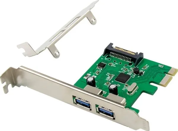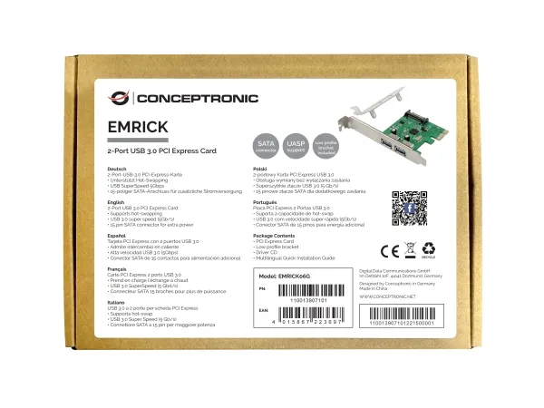 Conceptronic EMRICK 2-ports USB 3.2 Gen 2 PCI-Express-kort Hostinterface: PCIe Udgangsinterface: USB 3.2 Gen 1 (3.1 Gen 1) Udvidelseskort standard: PCI 2.0. Produktfarve: Grøn Formål: PC Oprindelsesland: Kina. Dataoverførselshastighed (maks.): 5 Gbit/s. Understøtter Windows-operativsystemer: Windows 10 Windows 10 Education Windows 10 Education x64 Windows 10 Enterprise Windows 10 Bredde: 61 mm Dybde: 65 mm Højde: 20 mm Dette PCI-Express-kort gør det muligt nemt at tilføje 2 ekstra SuperSpeed-USB 3.2 Gen 2-porte til din desktop-computer. Den har en maksimal datahastighed på 10 GB/s, er tilsvarende hurtig og kan kopiere store filer og dokumenter over og fra din desktop-computer. Du skal blot sætte USB 3.2 Gen 2-PCI-Express-kortet i din Express-kortstik, installere de medfølgende drivere, og du er klar til brug!