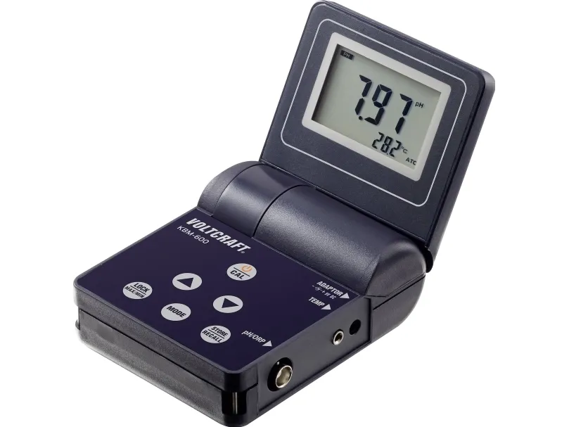 PH-redox temperatur måleapparat KBM-600 Stort LCD display med afskærmning Udviklet til anvendelse som greb- eller bordapparat Hals remme til Håndfri-betjening. Hukommelsesfunktion gemmer og ringer op til 150 måleværdier fra. Min/Max og data-lås Enkel kalibrering via et tastatur til 5-punkter buffer, kalibreringsværdi kan justeres efter behov Visning af procentdelen af stigning (PTS) efter kalibrering Automatisk slukning efter 10 minutter ikke er i brug Det KBM-600 er takket være sin forskellige målefunktioner kan anvendes universelt. Uanset om den skal anvendes til måling af pH-værdien, af redox-værdien eller ved måling af temperaturen af vand, KBM-600 har altid pålidelige tjenester. Under synsvinkel på præcision og brugervenlighed er dette måleapparat udviklet og erprobt.