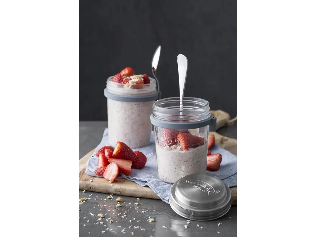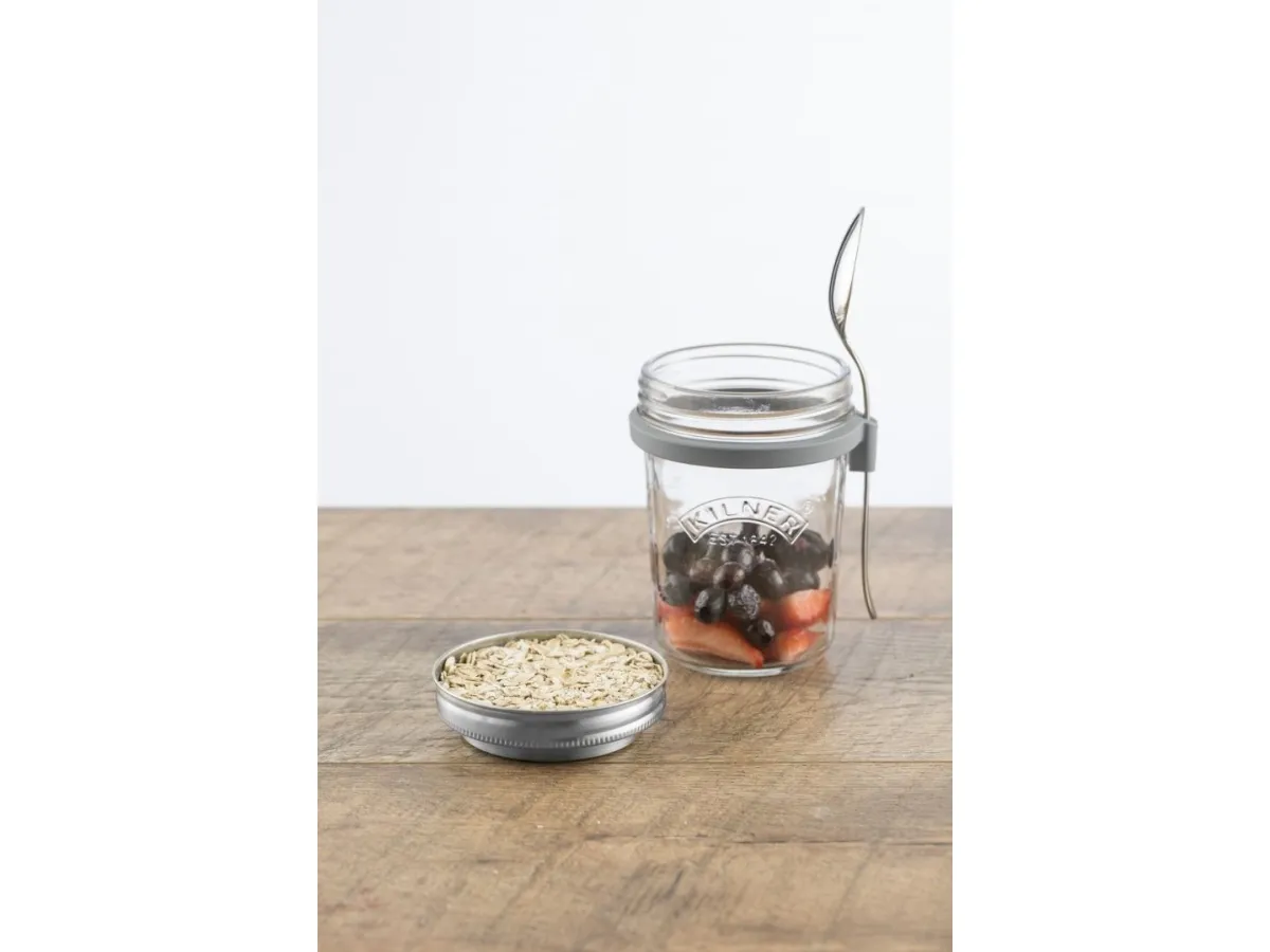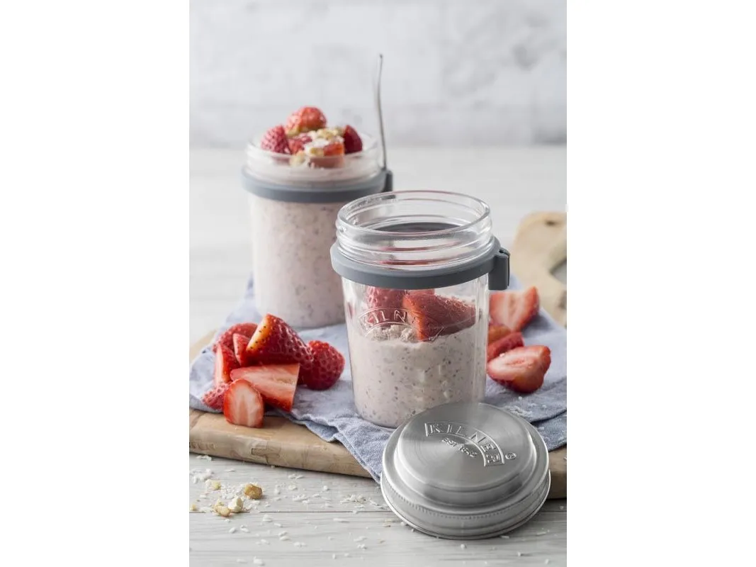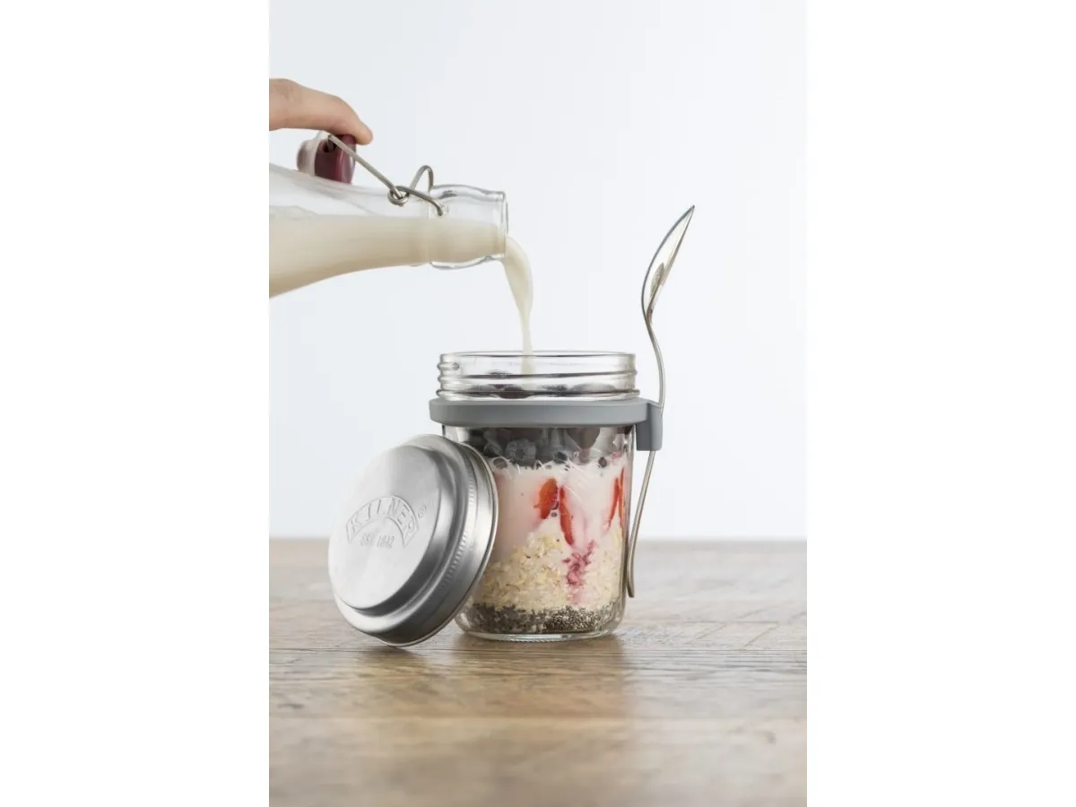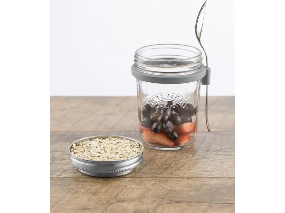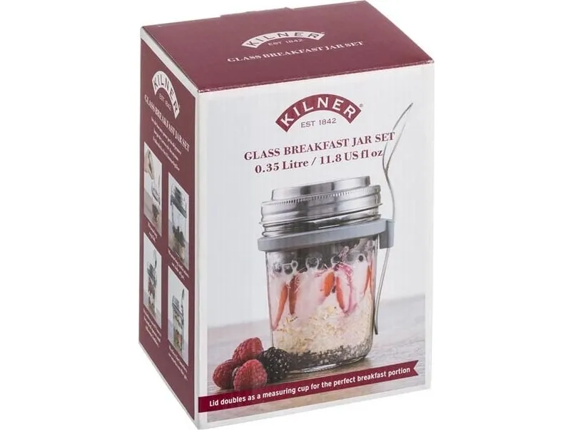 Kilners frukostset är perfekt för dig som gillar att göra overnight oats för att ta med dig. Locket består av rostfritt stål som även fungerar som ett mått för en portion. I setet ingår en sked och en praktisk skedhållare i silikon. Kapacitet 0,35 l, en perfekt portionsstorlek.