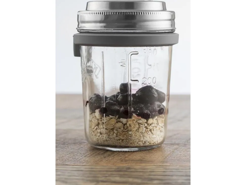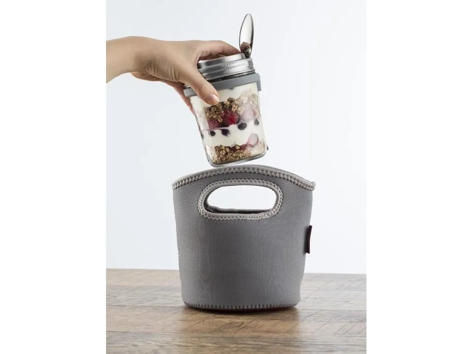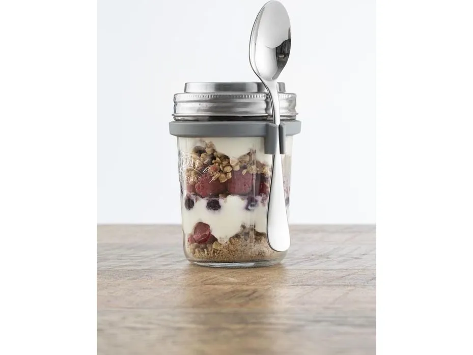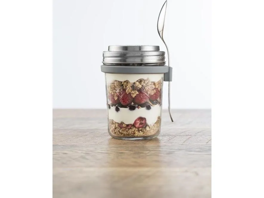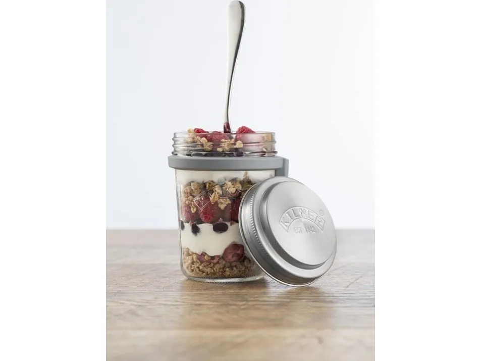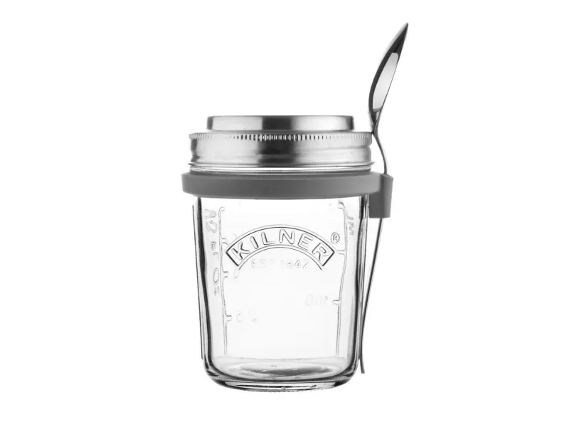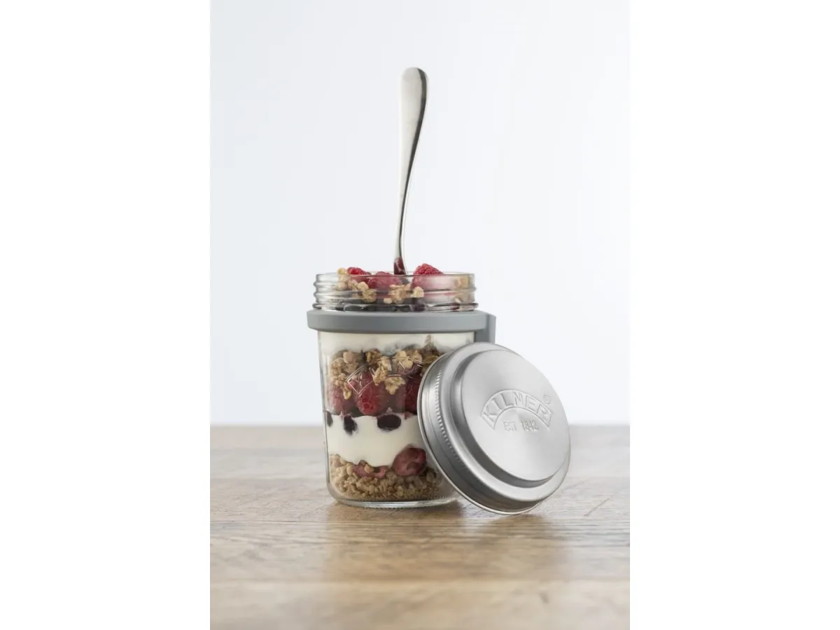 Kilners frukostset är perfekt för dig som gillar att göra overnight oats för att ta med dig. Locket består av rostfritt stål som även fungerar som ett mått för en portion. I setet ingår en sked och en praktisk skedhållare i silikon. Kapacitet 0,35 l, en perfekt portionsstorlek.