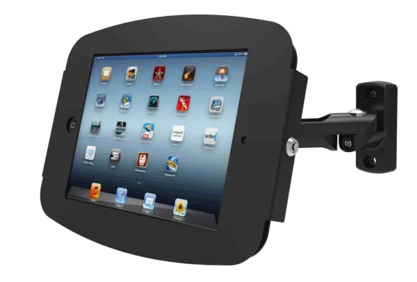 Adjustable swing arm and a Space iPad enclosure, that can be mounted on any flat surface and fits well even in limited spaces and corners. With 2 bendable joints and a tilting head, the swing arm enables great flexibility in setting the desired viewing angle.