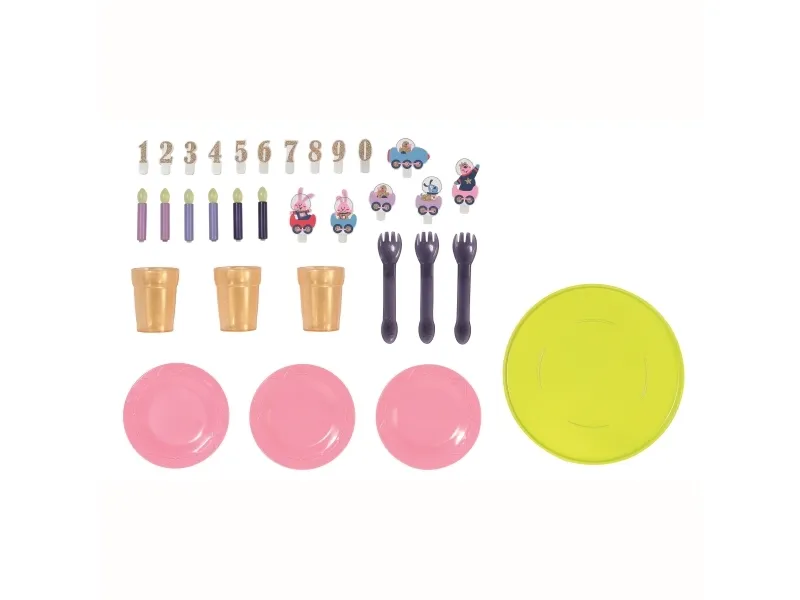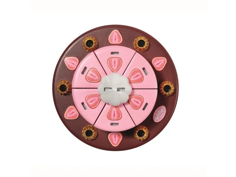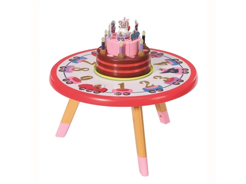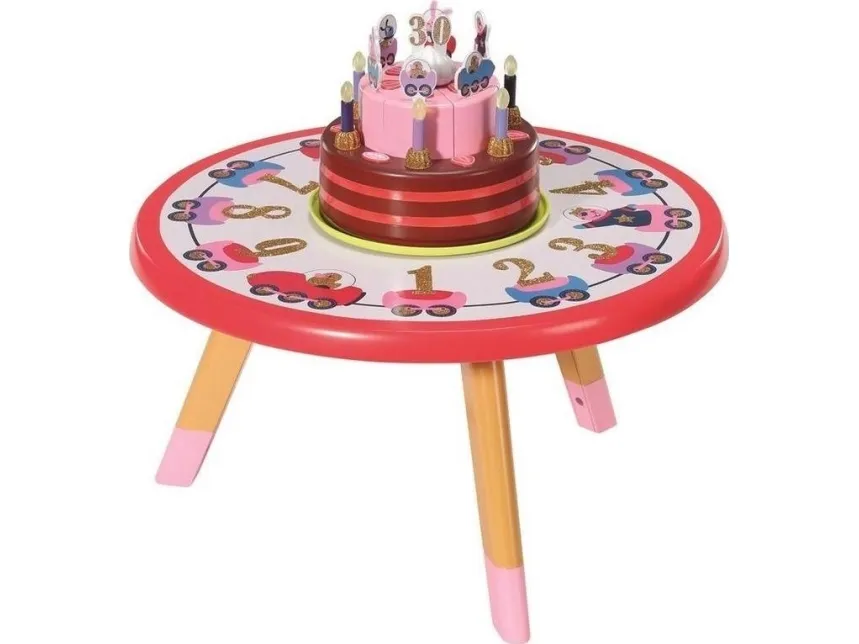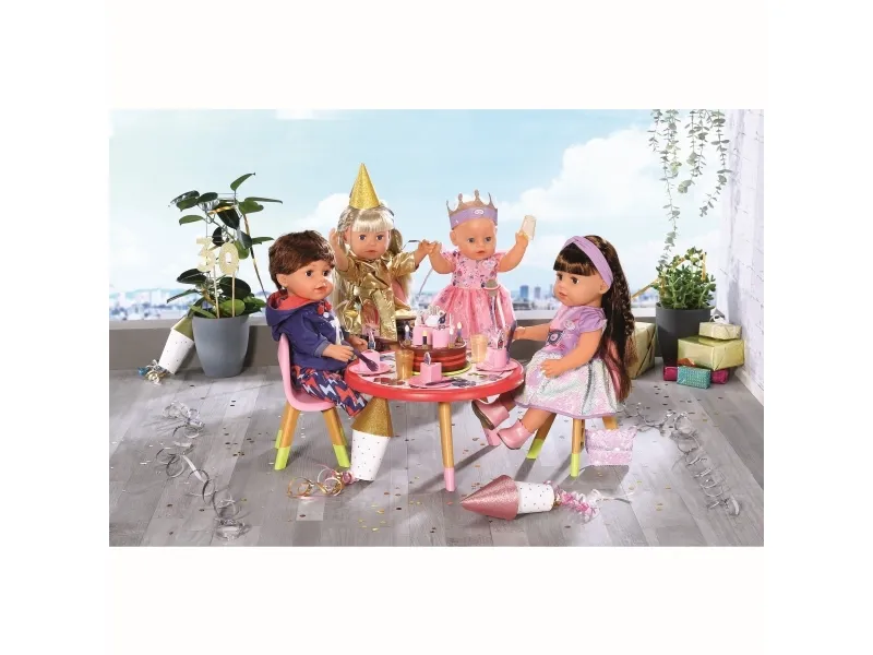 Bursdagsdekket bord med lys-og lydeffekter, bursdagskake m.m. En bursdagskake er prikken over i’en til enhver bursdagsfeiring. Hos BABY born er det et særlig fantasifullt eksemplar som plasseres på bordet. Kaken har to nivåer og er skåret ut i seks kakestykker som kan dekoreres med todimensjonale tall og bilder. Og mens BABY born blåser ut lysene spiller kaken bursdagssangen. BABY born og de to favorittgjestene hennes setter seg ved bursdagsbordet og er klare for fest. Bordplaten er pyntet med søte bursdagsmotiver og har et dreiefat til kaken i midten. Kvalitetstilbehør til BABY born dukken. Gir forbedret, mangfoldig og langvarig moro gjennom lek. Batterier kreves (ikke inkludert). Fra 3 år. Inkludert: - BABY born bursdagsbord med lys-og lydeffekter - 3 stoler, 3 tallerkener, 3 glass, 2 ark med klistermerker, 1 dreiefat og 1 bursdagskake med lys og tall- og motivpins