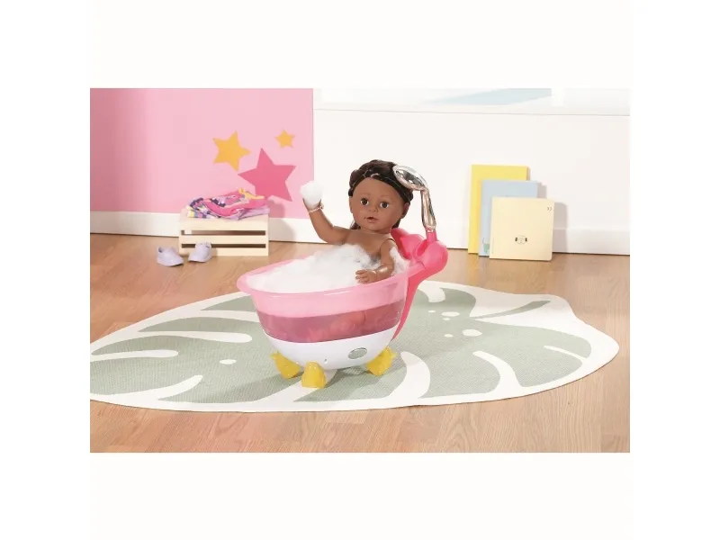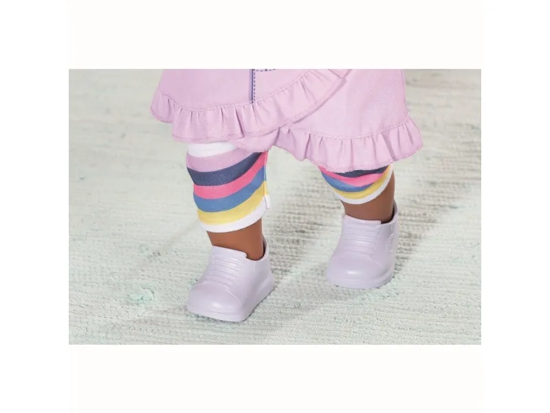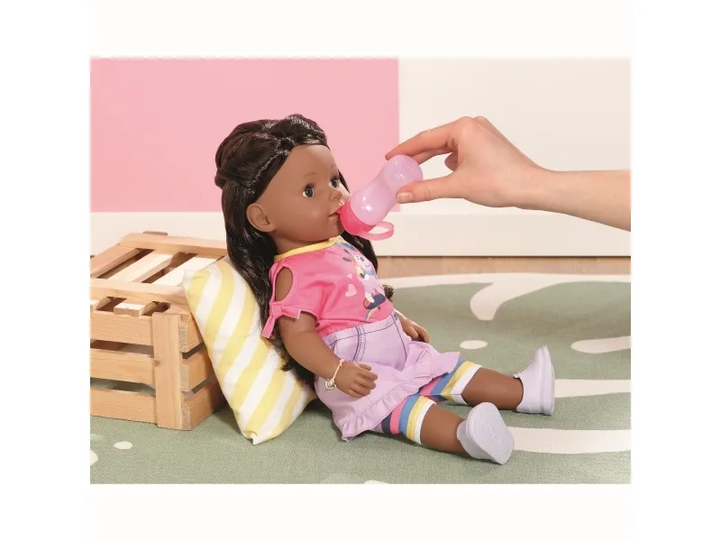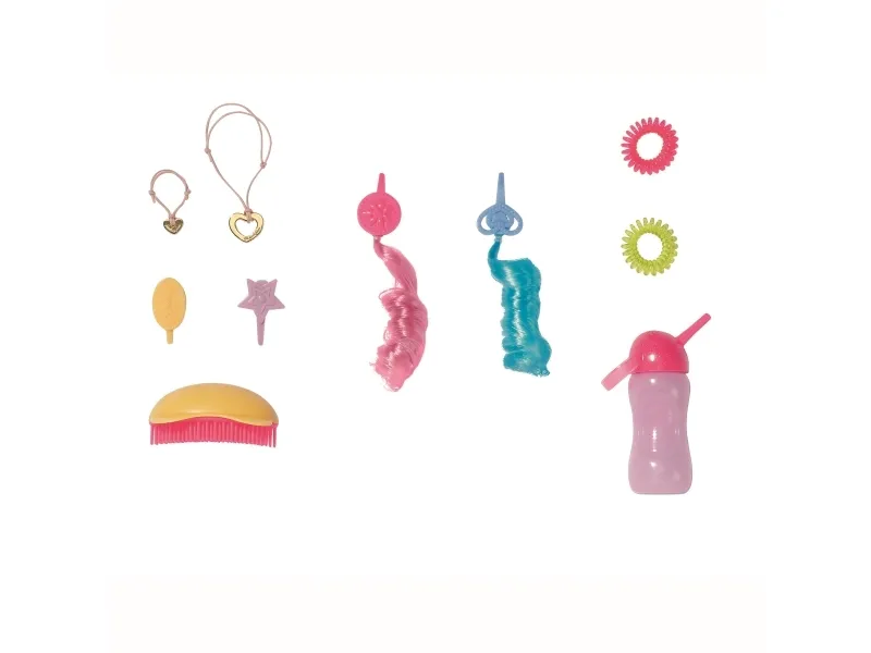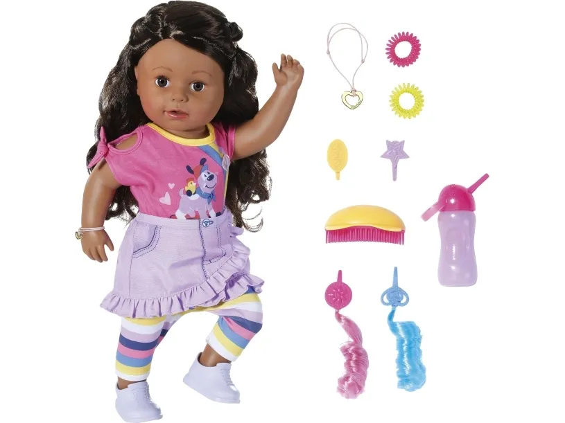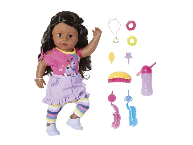 Søsteren med 6 funksjoner har 10 stk. tilbehør med seg. BABY born er helt fascinert av søsterens lokker og vil alltid leke frisør sammen med henne. Full av spenning klipper hun de fargerike forlengelsene i håret forskjellige steder. Den rosa og turkise passer godt sammen med det mørke håret. Jentedukken sitter tålmodig når hun blir børstet med børsten, og flettene blir dekorert med hårstrikk og spenner. Når hun blir dratt i håret under hårklippen kan hun felle en dukketåre. Men hun kan bare gjøre dette hvis hun tidligere har drukket vann fra flasken. De fleksible knærne gjør at hun ikke bare kan sitte komfortabelt, men også å stå alene. Men hvorfor stå og sitte når du kan ligge og slappe av i BABY born badekaret? Søster har på seg en kjole med en rosa topp med et spesielt knuteelement på skulderen og et lilla skjørt i asymmetrisk design. De stripete leggingsene fanger regnbuens farger på blusen. Joggeskoene hennes er i en diskret hvitfarge. BABY born søster med seks livaktige funksjoner inspirerer til variert rollespill og lek, noe som fremmer fantasi og støtter utviklingen av sosiale ferdigheter og verdier. Fra 4 år. Inkluderer: - BABY born søster 43 cm med kjole, leggings og sko - flaske, hårbørste, 2 spiralstrikk, 2 hårklipp, 2 klipp med hårforlengelser og 1 vennskapsarmbånd hver for barn og dukke