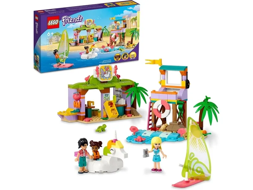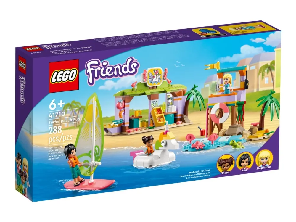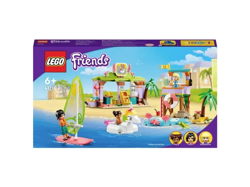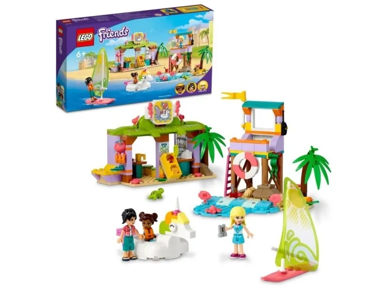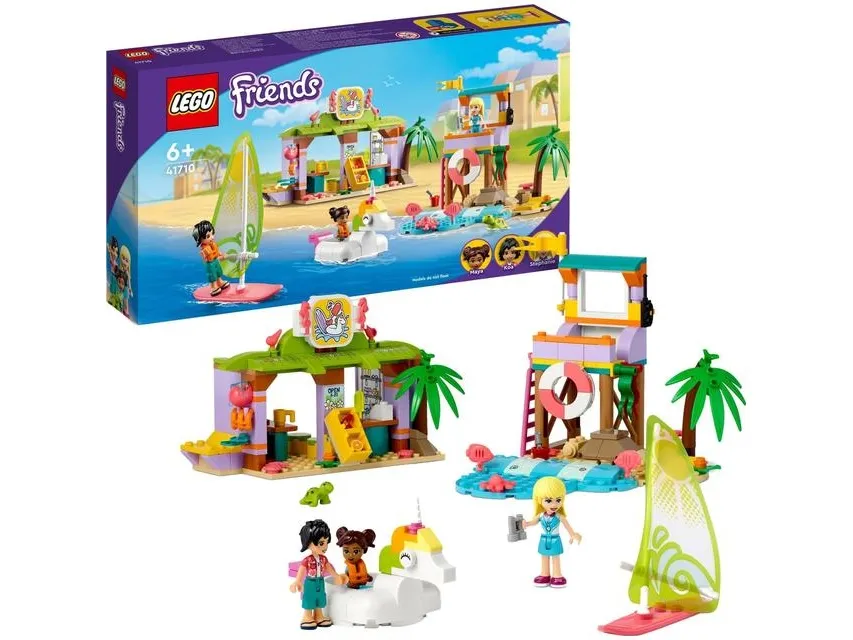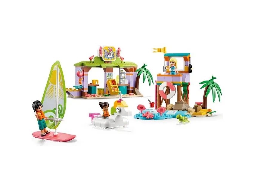 Masse å utforske – inkluderer utkikkstårn, enhjørningspyntet gummibåt, seilbrett, surfeskole med klasserom, dusj og utleieservice samt figurer av LEGO® Friends Stephanie, Koa og Maya