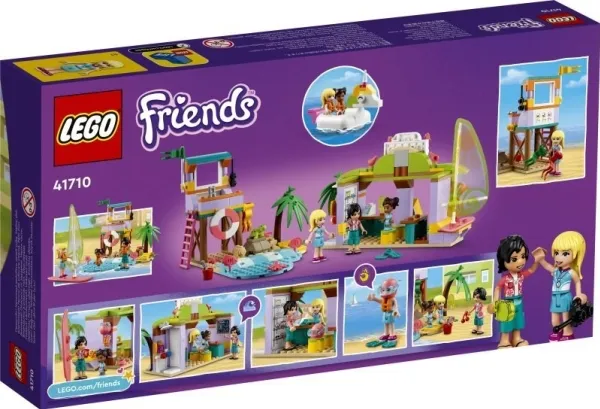 Med settet LEGO® Friends Surfing og strandmoro (41710) kan barn fra seks år ri på en bølge av kreativitet og leke i timevis med alle de kule detaljene og lekene. Settet inkluderer spennende modeller og tilbehør, inkludert et utkikkstårn, en surfeskole med utleieservice og en enhjørningspyntet gummibåt samt masse søtt og kreativt utstyr med strandtema.