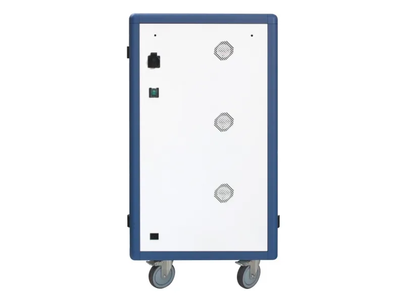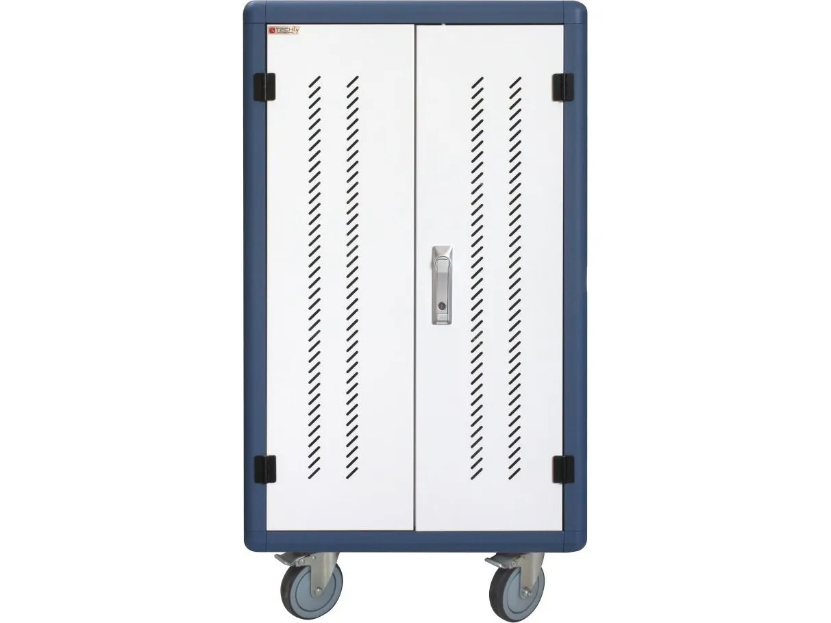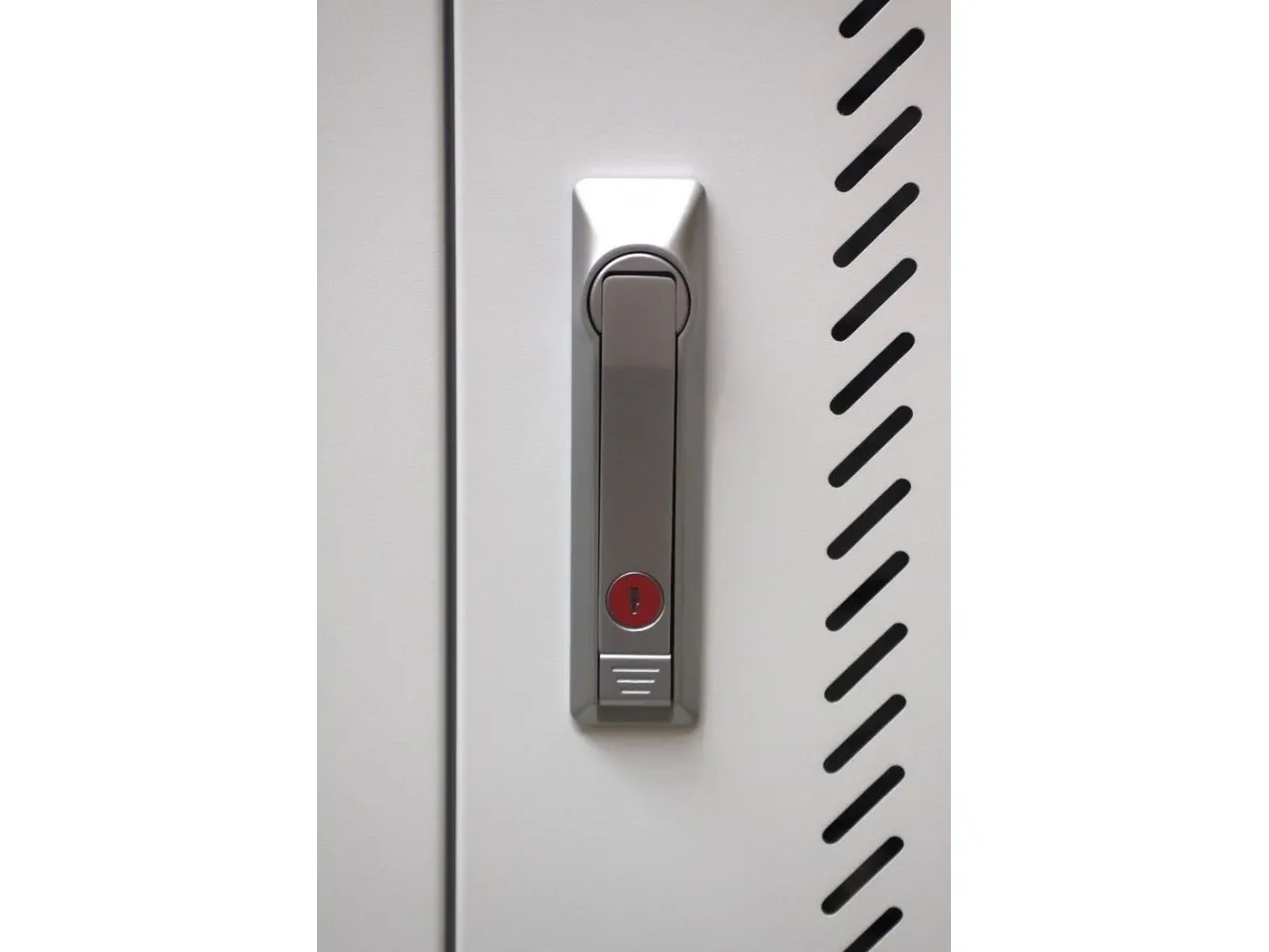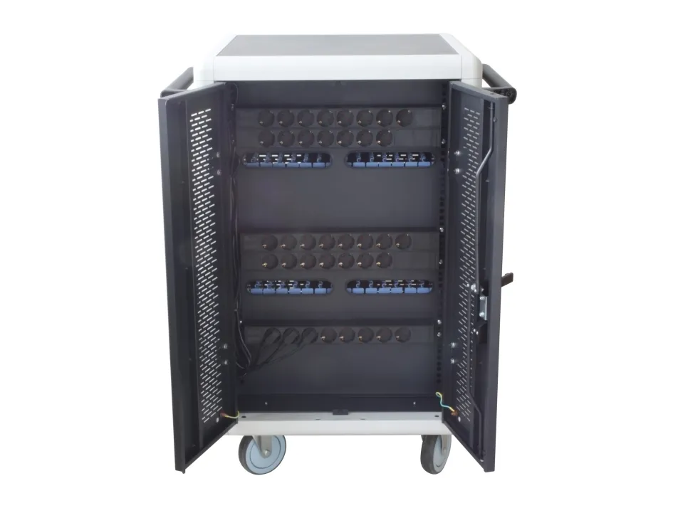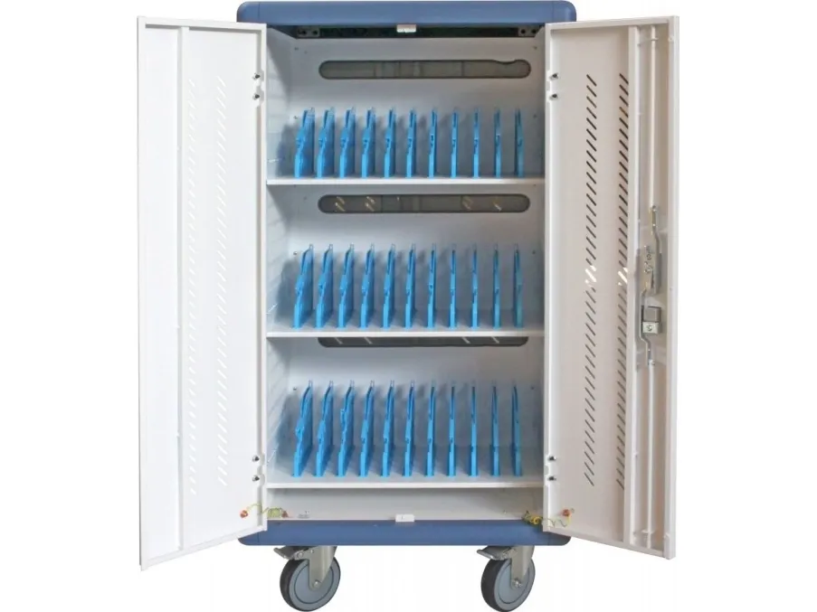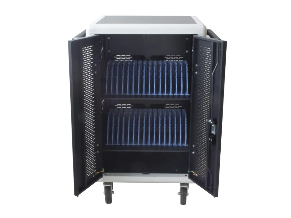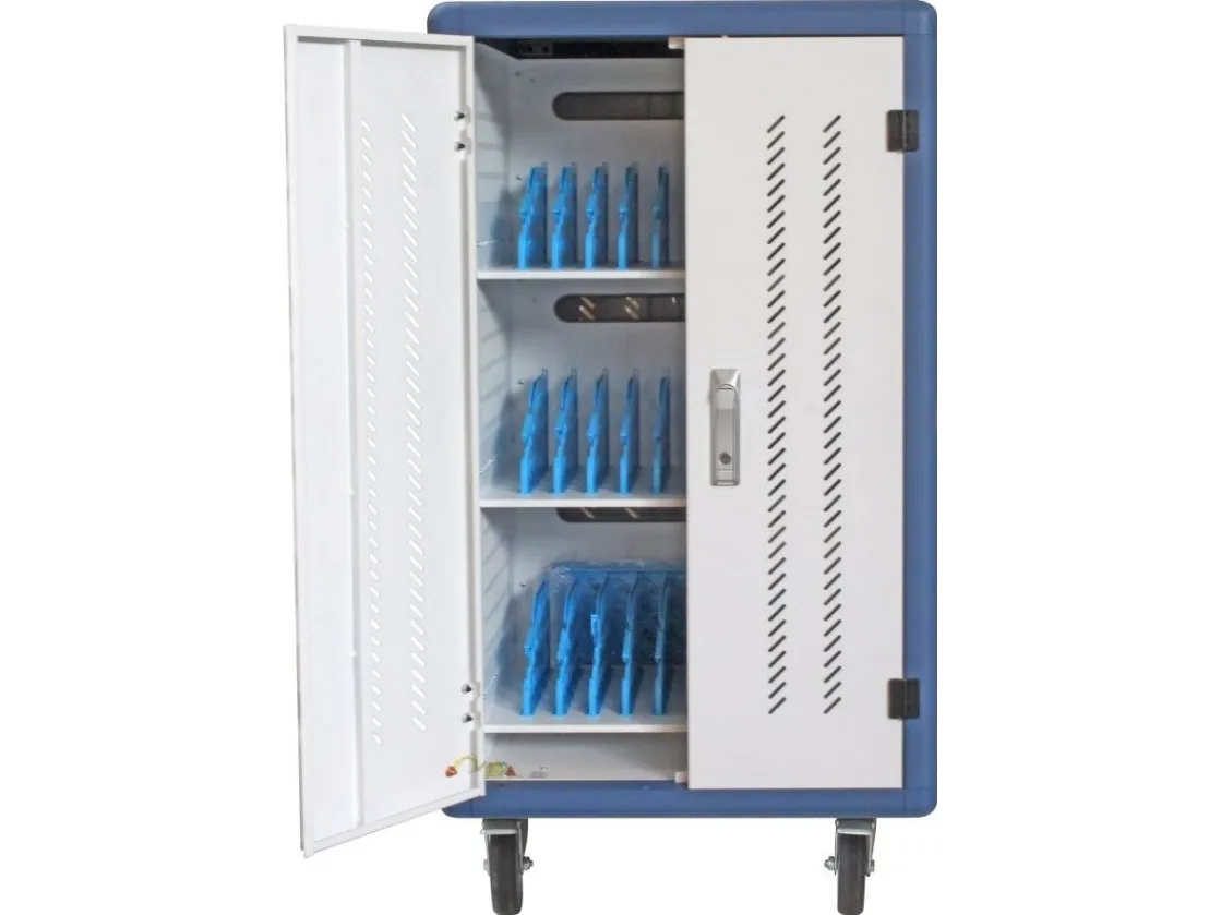 I-CABINET-30DTY has been specifically designed as a trolley and universal charging station for tablets and smartphones. Its sturdy innovative construction, the electronics dedicated to safety and the secure key-locking system make it an ideal solution for offices, computer labs and classrooms where numerous ICT devices must be securely located and recharged for use during the next day. It is a safe place to store, synchronize and charge multiple mobile devices simultaneously. The closed and ventilated storage area keeps the charging devices safe. Thanks to its small size, it can hold up to 30 tablets / iPads, smartphones / iPhones or notebooks in very little space. It is equipped with four solid wheels, two of which with brakes, to be easily moved and repositioned inside the classroom. The upper external surface allows a comfortable support of notebook or other electronic equipment and is predisposed for the assembly of optional fans.