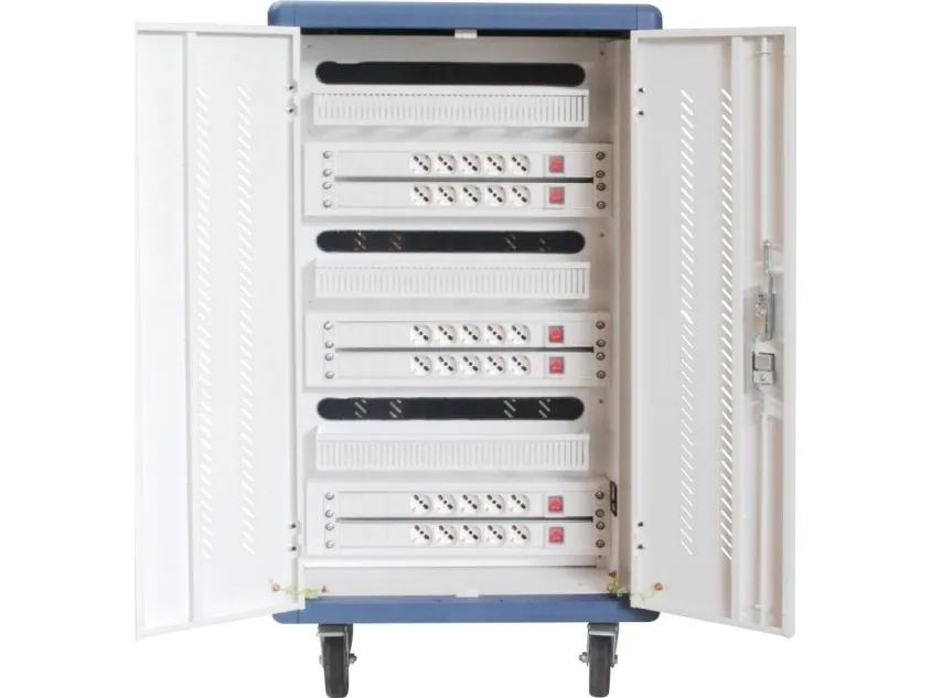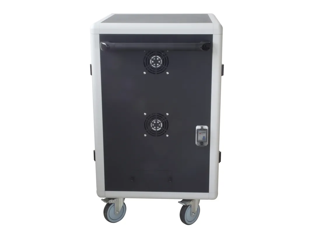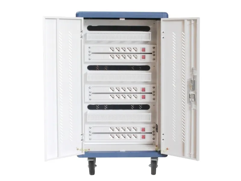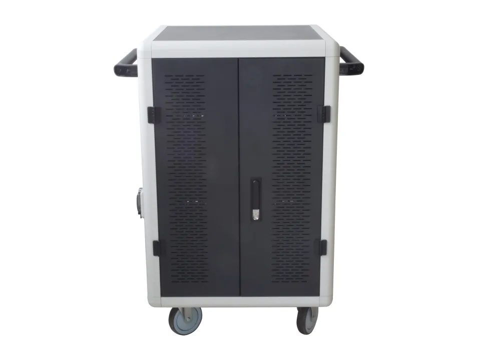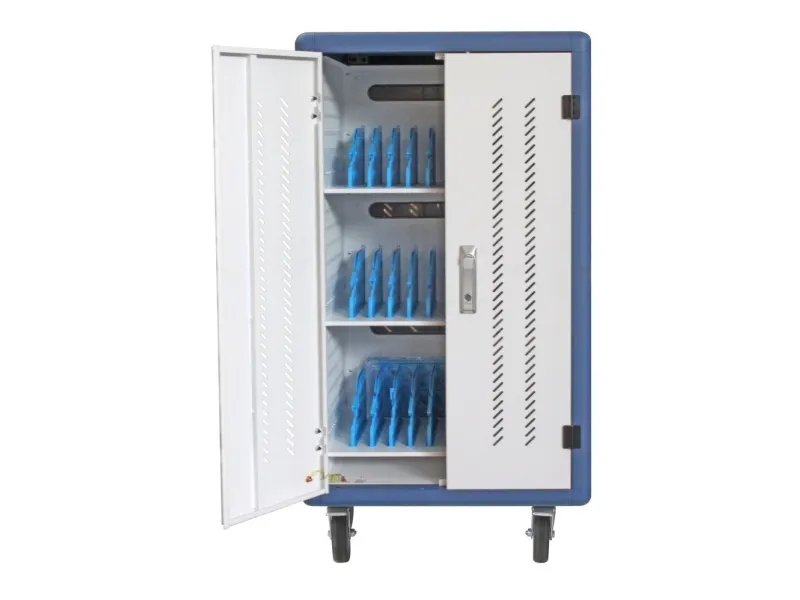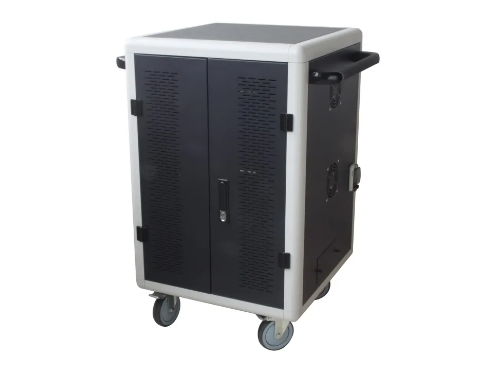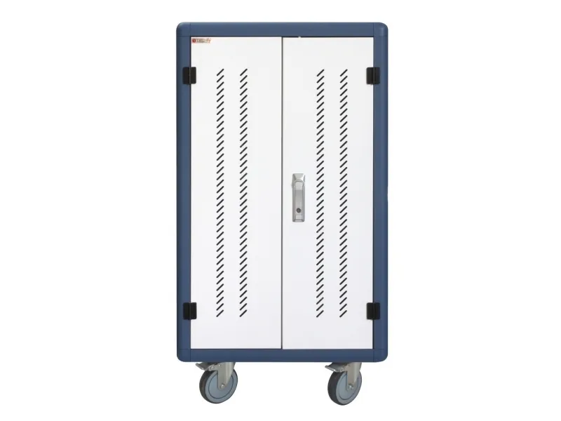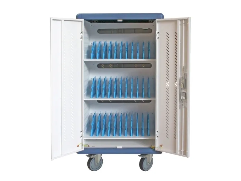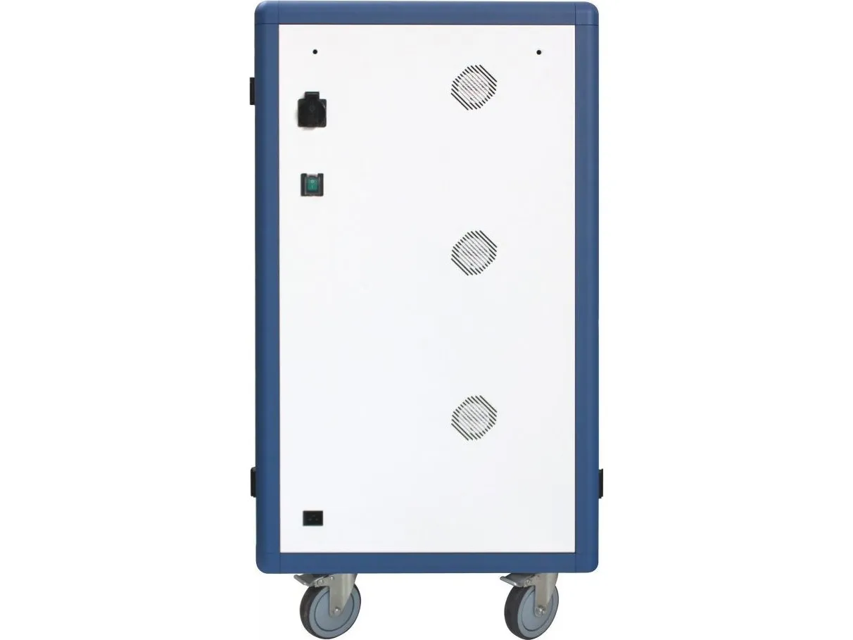 I-CABINET-30DTY has been specifically designed as a trolley and universal charging station for tablets and smartphones. Its sturdy innovative construction, the electronics dedicated to safety and the secure key-locking system make it an ideal solution for offices, computer labs and classrooms where numerous ICT devices must be securely located and recharged for use during the next day. It is a safe place to store, synchronize and charge multiple mobile devices simultaneously. The closed and ventilated storage area keeps the charging devices safe. Thanks to its small size, it can hold up to 30 tablets / iPads, smartphones / iPhones or notebooks in very little space. It is equipped with four solid wheels, two of which with brakes, to be easily moved and repositioned inside the classroom. The upper external surface allows a comfortable support of notebook or other electronic equipment and is predisposed for the assembly of optional fans.