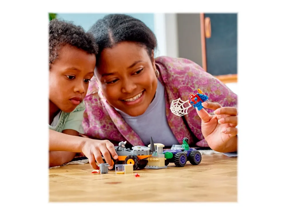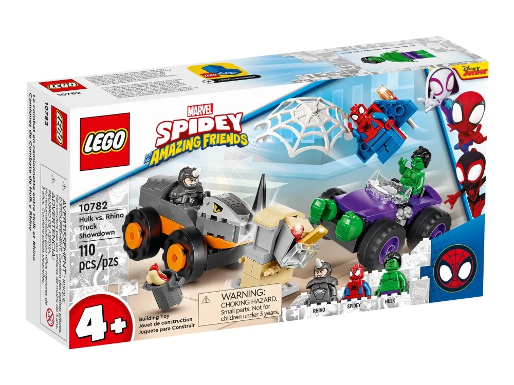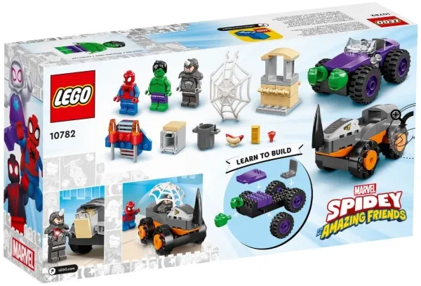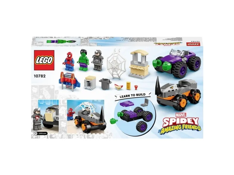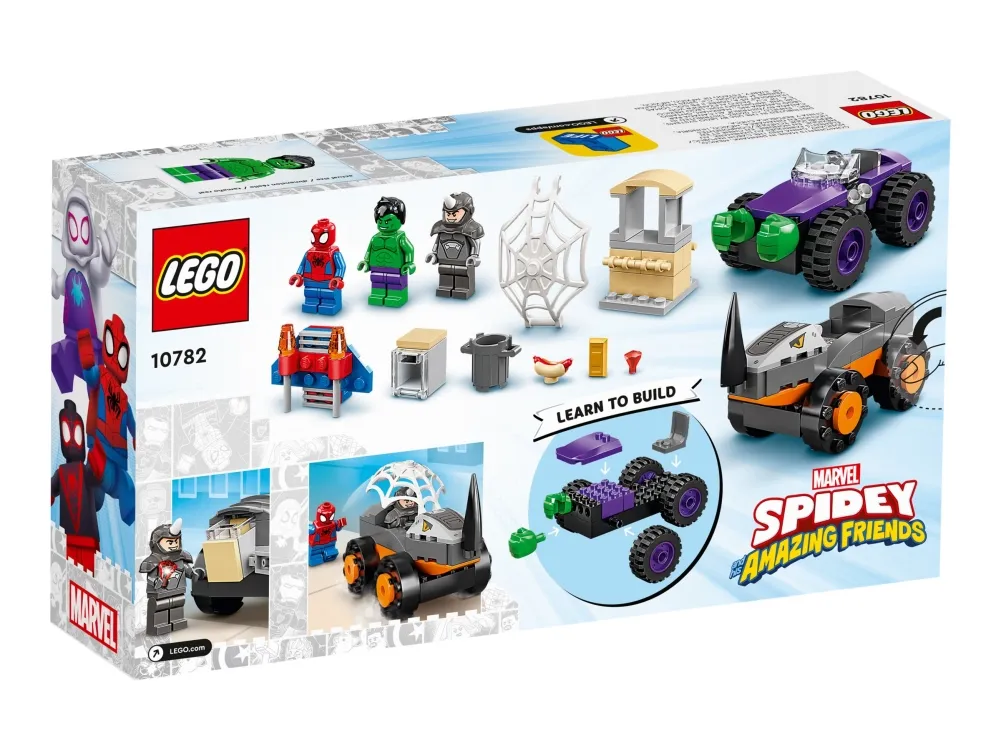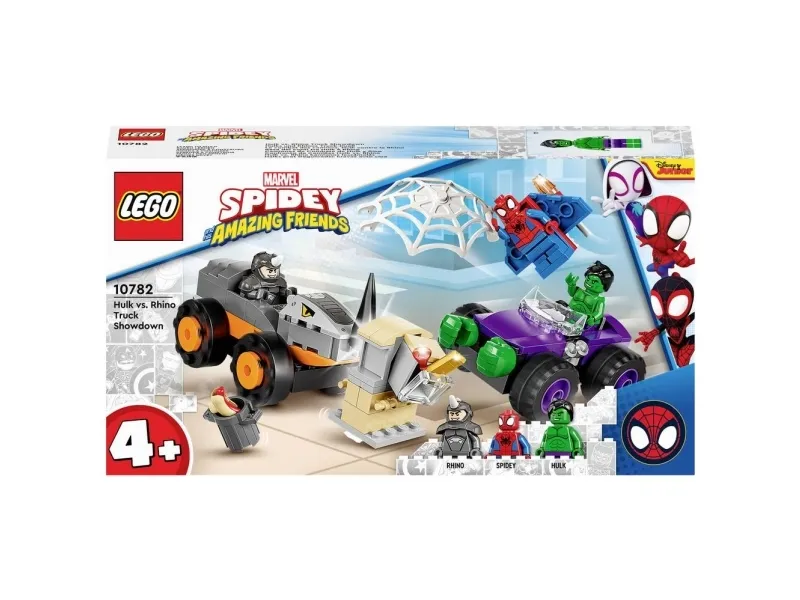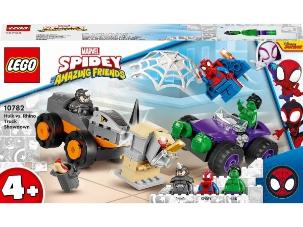 Byggeleken LEGO® Marvel Spidey og de fantastiske vennene hans vs. Oppgjør mellom Hulk og Rhino-truck (10782) setter barn fra fire år og oppover i førersetet mens de kjører rundt for å redde dagen. Barna gjenskaper scener som er inspirert av den populære TV-serien på Disney+, mens de hjelper Spidey og Hulk med å hindre at Rhino raner banken. Barna kommer til å elske kampvognene i dette samleobjektet av et byggbare lekesettet. Hvert monsterkjøretøy inneholder kule detaljer – Rhino sitt kjøretøy har en rambukk, mens Hulk har enorme hender som er klar til å smadre fienden.