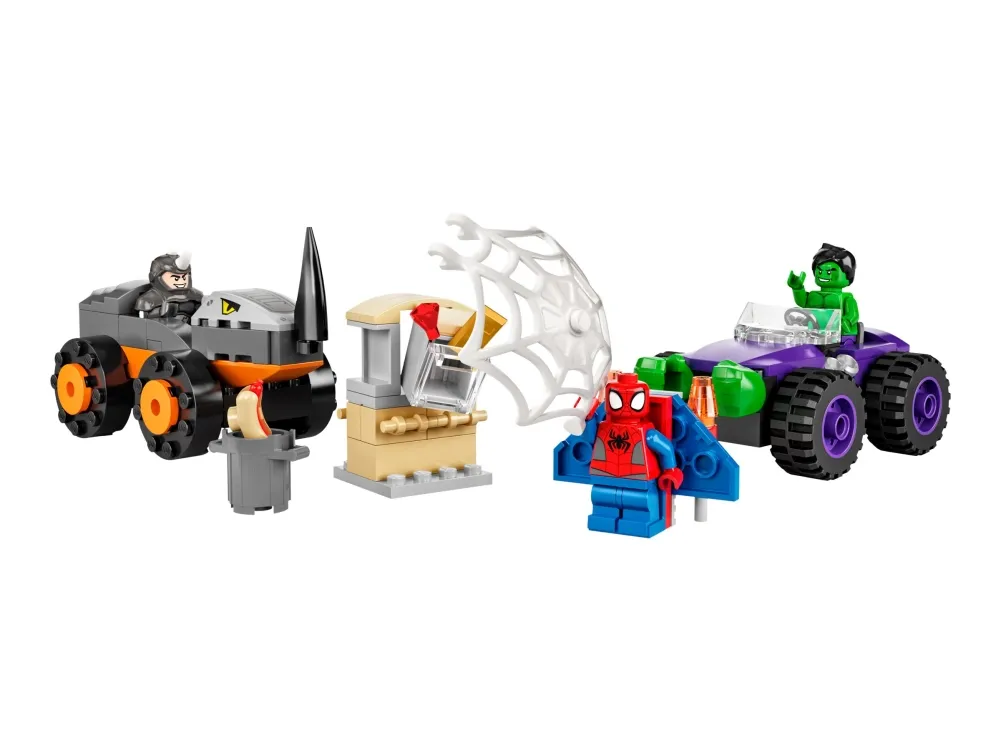 Spidey og Hulk stanser Rhino: Barn og voksne kommer til å elske at disse to monsterbilene krasjer mot hverandre, og at Spidey flyr inn og fanger Rhino i nettet – dagen er reddet!